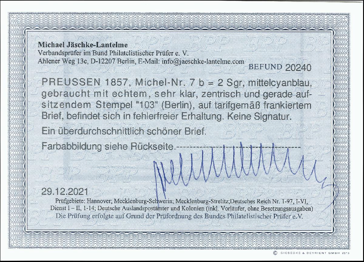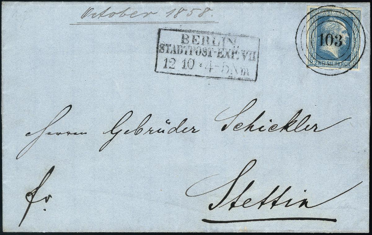 | Zusatzinformationen und Suchstichworte: | 378. Auktion Heinrich Köhler Auktionstermin 21.-26. März 2022 Los 147 2 Silbergroschen hellblau, farbfrisch und voll- bis breitrandig mit zentrisch und klar aufgesetzter Nr. „103“ und nebengesetztem Rahmenstempel „BERLIN STADTPOST-EXP. VII 12 10“ (1858) auf komplettem Faltbrief nach Stettin. Tadellos. Fotobefund Jäschke-Lantelme BPP Ausruf 150,00 EUR Zuschlag 540,00 EUR (aus der Sammlung Erivan Haub) |