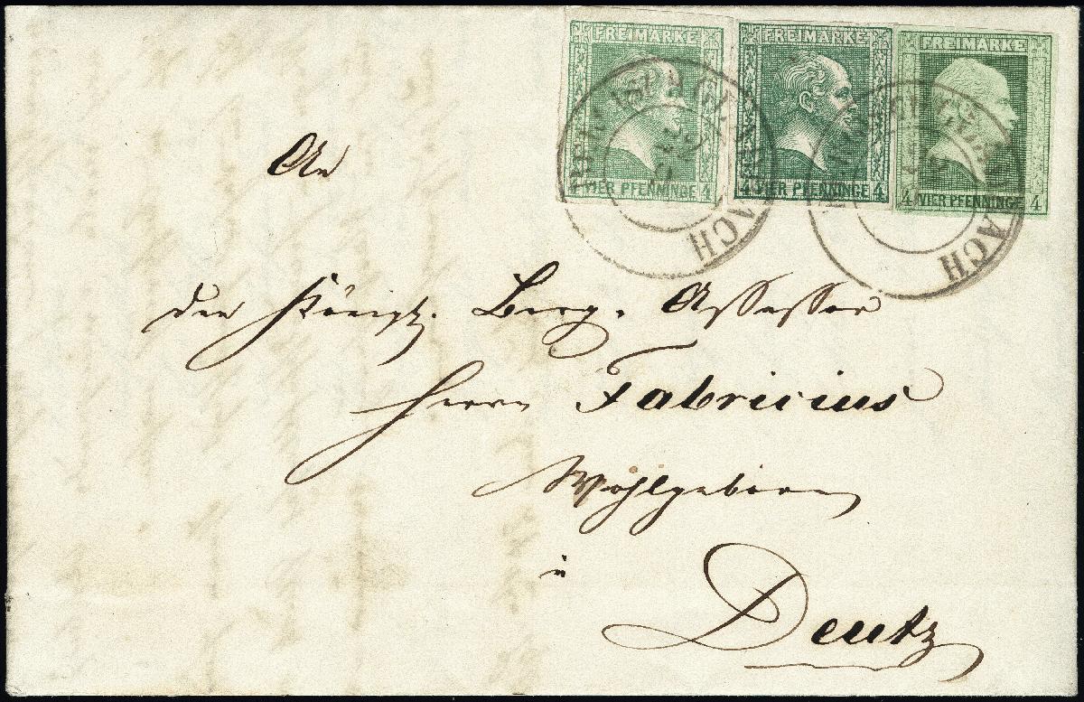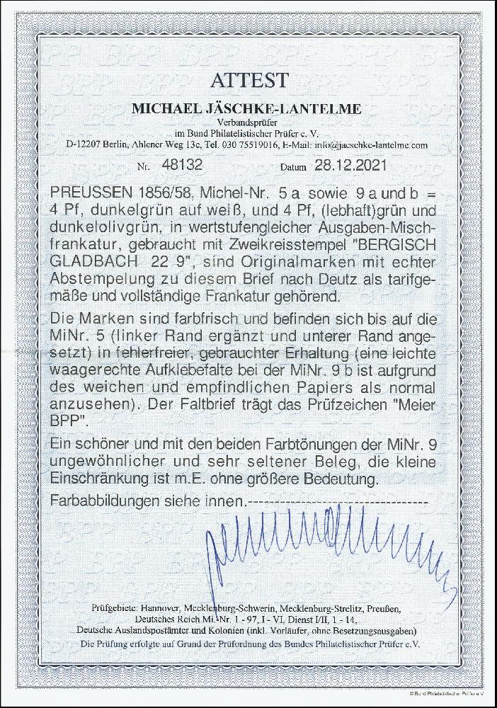 | Zusatzinformationen und Suchstichworte: | 378. Auktion Heinrich Köhler Auktionstermin 21.-26. März 2022 Los 150 4 Pfennig grün und 4 Pfennig dunkelolivgrün, beide farbfrisch und voll-bis breitrandig, in wertstufengleicher Mischfrankatur mit 1856, 4 Pfennig grün (linker Rand oben ergänzt und unterer Rand angesetzt) mit zwei mal sauber aufgesetztem Doppelkreisstempel „BERGISCH GLADBACH 22/9“ auf komplettem Faltbrief nach Deutz. Sehr schöne frische und ansonsten einwandfreie Erhaltung. Eine sehr seltene und äußerst attraktive Mischfrankatur. Fotoattest Jäschke-Lantelme BPP (2021) Ausruf 1.000,00 EUR Zuschlag 3.600,00 EUR (aus der Sammlung Erivan Haub) |