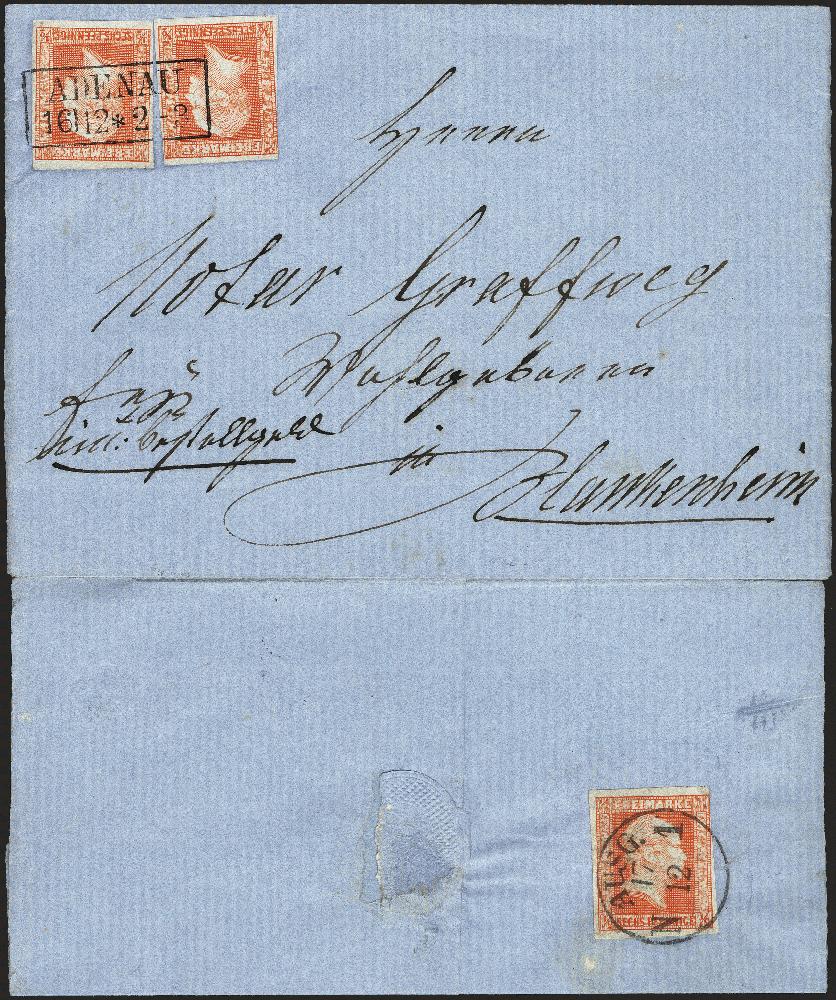 | Zusatzinformationen und Suchstichworte: | 378. Auktion Heinrich Köhler Auktionstermin 21.-26. März 2022 Los 160 1859, Ergänzungswert ½ Silbergroschen rötlichorange, drei Einzelwerte, vorder- bzw. einer als Bestellgeld rückseitig geklebt, auf komplettem Faltbrief von „ADENAU 16/12“ (1862) nach Blankenheim. Zwei Werte kurz berührt, sonst voll-bis breitbandig und farbfrisch, die rückseitige Marke mit kleinem geschlossenen Randspalt; der Faltbrief teils aufgeschnitten, ergänzt und etwas umgefaltet. Ein ungewöhnlicher und durchaus attraktiver Eifel-Beleg. Fotoatteste Flemming BPP (1991) und Jäschke-Lantelme BPP (2021) Ausruf 500,00 EUR Zuschlag 800,00 EUR (aus der Sammlung Erivan Haub) |
