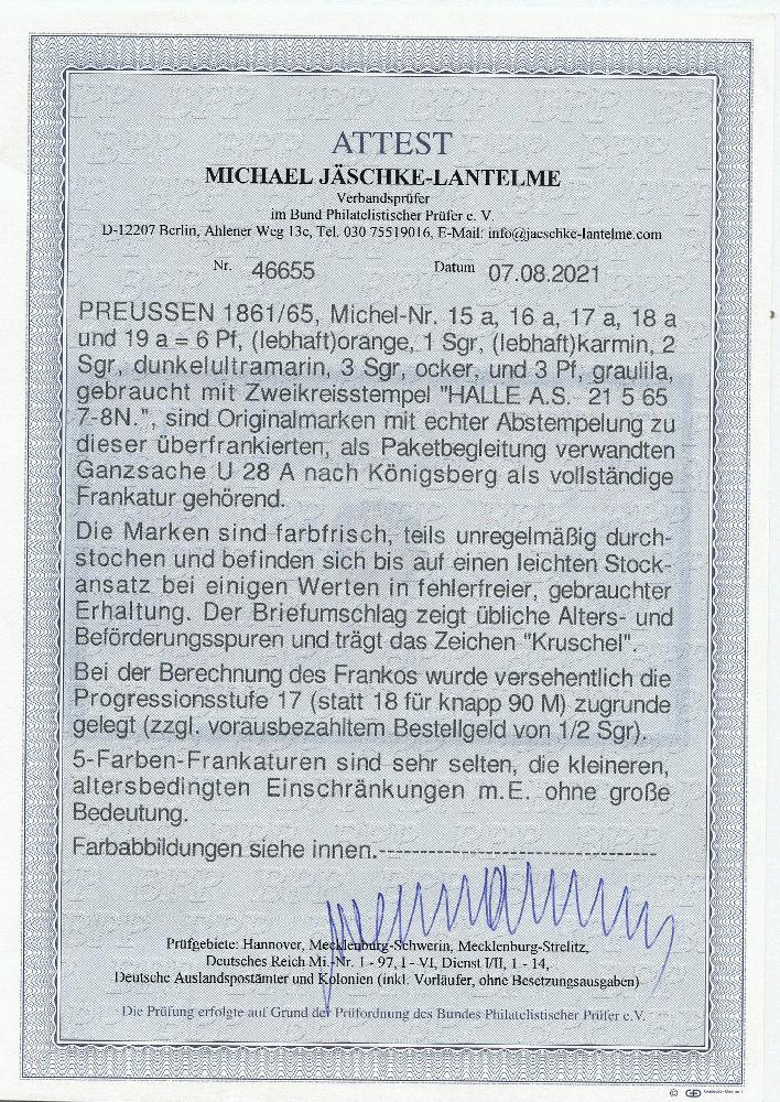 | Zusatzinformationen und Suchstichworte: | 378. Auktion Heinrich Köhler Auktionstermin 21.-26. März 2022 Los 162 6 Pfennig orange, zwei Einzelwerte zusammen mit senkrechtem Paar und Einzelwert 1 Silbergroschen rosa, Einzelwerten 2 Silbergroschen ultramarin und 3 Silbergroschen ocker sowie 2 Paaren und Einzelwert 3 Pfennige graulila, als Zufrankatur auf Ganzsachenumschlag 3 Silbergroschen braun, mit Doppelkreisstempel „HALLE A. S. 21 5 65“ als Paketbegleitbrief nach Königsberg. Die Frankatur ist farbfrisch und bis auf teils etwas unregelmäßigen Durchstich und leichtem Stockansatz bei einigen Werten in fehlerfreier Erhaltung. Bei der Berechnung des Francos wurde versehentlich die Progressionsstufe 17 zugrunde gelegt (statt Stufe 12 für knapp 90 Meilen). Eine beeindruckende und sehr seltene 5-Farben-Frankatur der Wappenausgabe. Fotoattest Jäschke-Lantelme BPP (2021) Ausruf 500,00 EUR Zuschlag 6.000,00 EUR (aus der Sammlung Erivan Haub) |