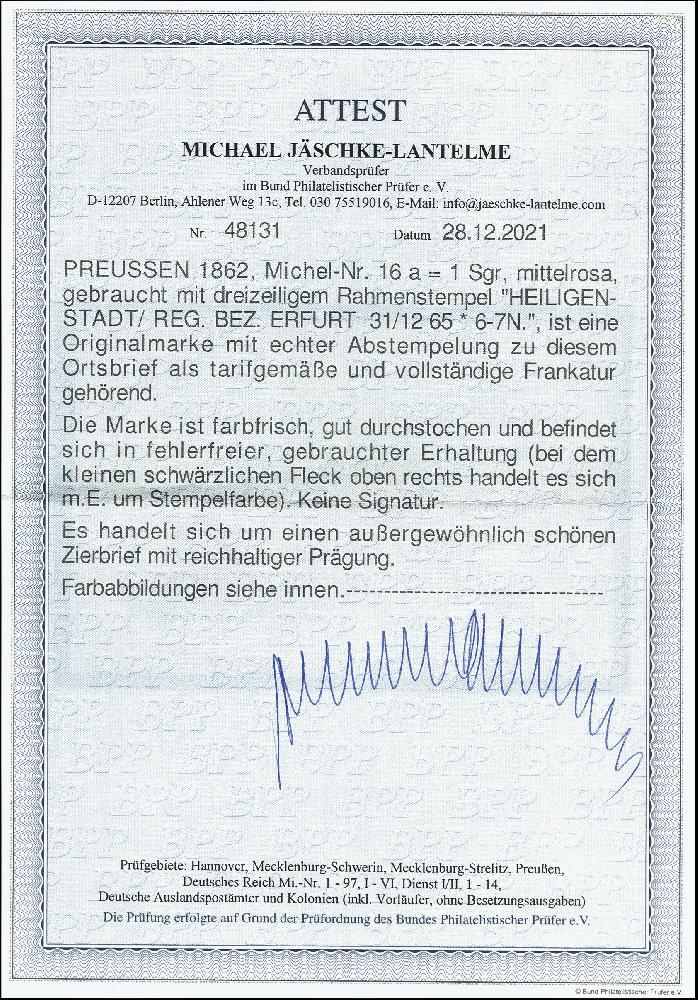 | Zusatzinformationen und Suchstichworte: | 378. Auktion Heinrich Köhler Auktionstermin 21.-26. März 2022 Los 163 1 Silbergroschen rosa, farbfrisch und gut durchstochen mit auf- und nebengesetztem Rahmenstempel „HEILIGENSTADT REG.BEZ.ERFURT 31.12.65“ auf Briefkuvert mit dekorativer Zierprägung im Ort gelaufen. Ein sehr dekoratives Stück. Fotoattest Jäschke-Lantelme BPP (2021) Ausruf 500,00 EUR Zuschlag 580,00 EUR (aus der Sammlung Erivan Haub) |