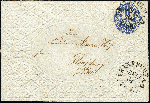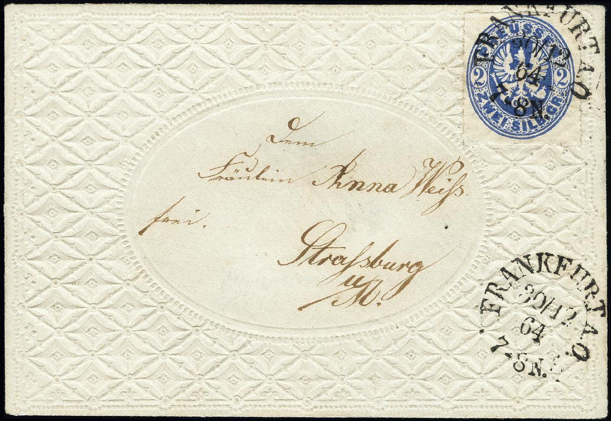 | Zusatzinformationen und Suchstichworte: | 378. Auktion Heinrich Köhler Auktionstermin 21.-26. März 2022 Los 164 2 Silbergroschen ultramarin, farbfrisch und gut durchstochen mit sauber auf- und nebengesetztem, sogenanntem ‚Versuchsstempel‘ ohne Einfassung „FRANKFURT A. O. 30/12 64“ auf kleinem Briefkuvert mit vorder- und rückseitiger flächiger Zierprägung nach Straßburg mit Ausgabestempeln. Ein sehr attraktiver Brief mit dem seltenen Stempel, dessen Verwendung nur vom 29. 12. 1864 bis 20.1.1865 registriert ist. Fotoattest Jäschke-Lantelme BPP (2021) Ausruf 800,00 EUR Zuschlag 3.000,00 EUR (aus der Sammlung Erivan Haub) |