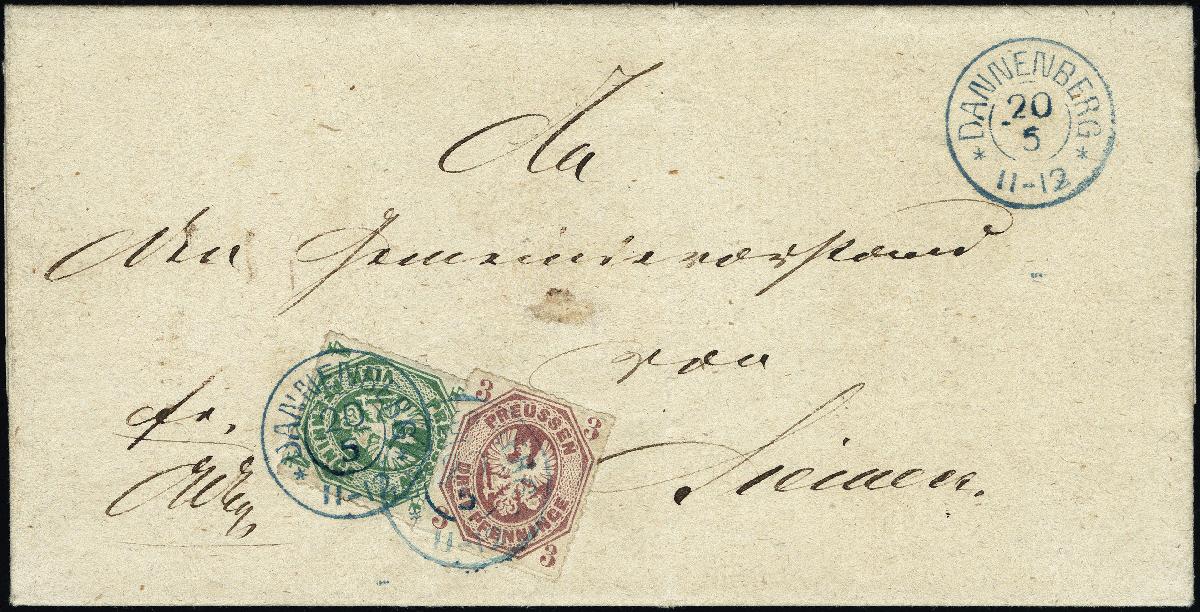 | Zusatzinformationen und Suchstichworte: | 378. Auktion Heinrich Köhler Auktionstermin 21.-26. März 2022 Los 169 3 Pfennig graulila und 4 Pfennig grün, beide farbfrisch und gut durchstochen mit sauber auf- und nebengesetztem Hannover-Doppelkreisstempel „DANNENBERG 20 5“ auf um 1 Pfennig überfrankiertem Brief in den Landbestellbereich nach Siemen. Außerhalb der Frankatur unauffällige Schürfungen im Briefpapier, einmal hinterlegt, sonst sehr schöne und frische Erhaltung. Ein dekorativer Brief mit ungewöhnlicher Verwendung der beiden kleinen Werte, die wir so nur ein weiteres Mal registriert haben. Fotoattest Jäschke-Lantelme BPP Ausruf 300,00 EUR Zuschlag 1.800,00 EUR (aus der Sammlung Erivan Haub) |