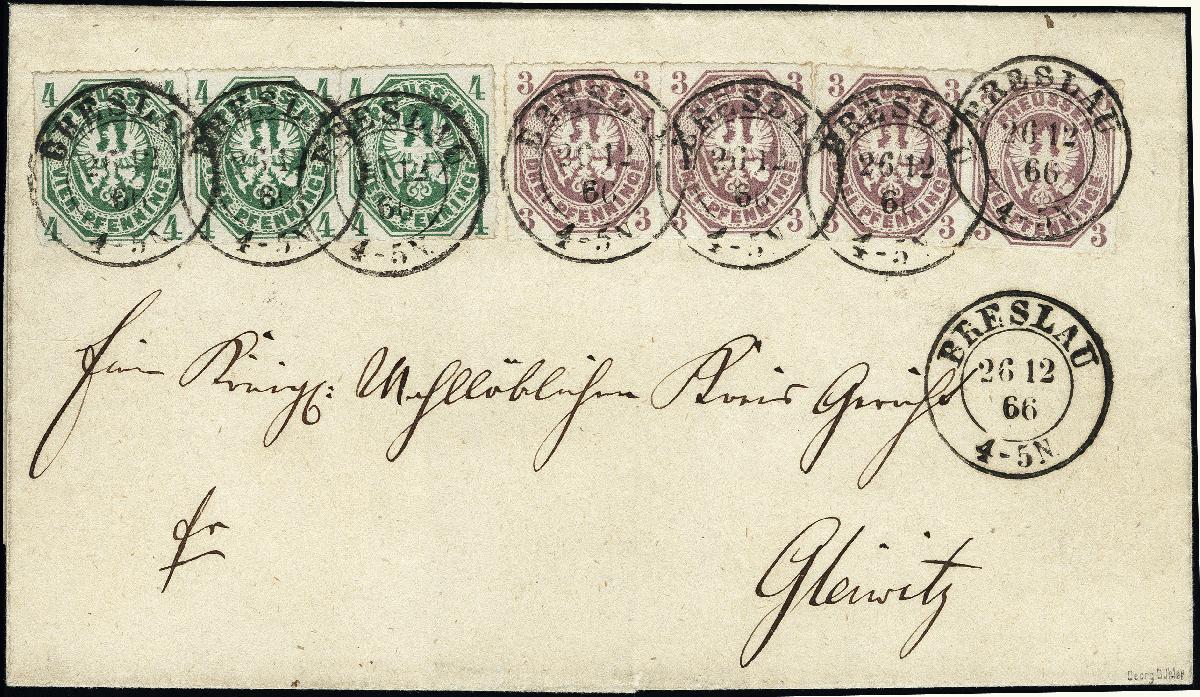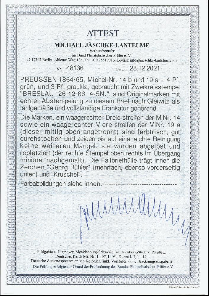 | Zusatzinformationen und Suchstichworte: | 378. Auktion Heinrich Köhler Auktionstermin 21.-26. März 2022 Los 170 3 Pfennig graulila im waagerechten Viererstreifen (mittig oben angetrennt) und 4 Pfennig dunkelgrün im waagerechten Dreierstreifen, beide farbfrisch und gut durchstochen, mit sauber auf- und nebengesetztem Doppelkreisstempel „BRESLAU 26 12 66“ auf Briefhülle nach Gleiwitz. Bis auf eine leichte Reinigung tadellos. Eine hochattraktive und in dieser Kombination wohl einmalige 2 Silbergroschen-Frankatur. Signiert Georg Bühler und Kruschel, Fotoattest Jäschke-Lantelme BPP (2021) Ausruf 1.000,00 EUR Zuschlag 4.200,00 EUR (aus der Sammlung Erivan Haub) |