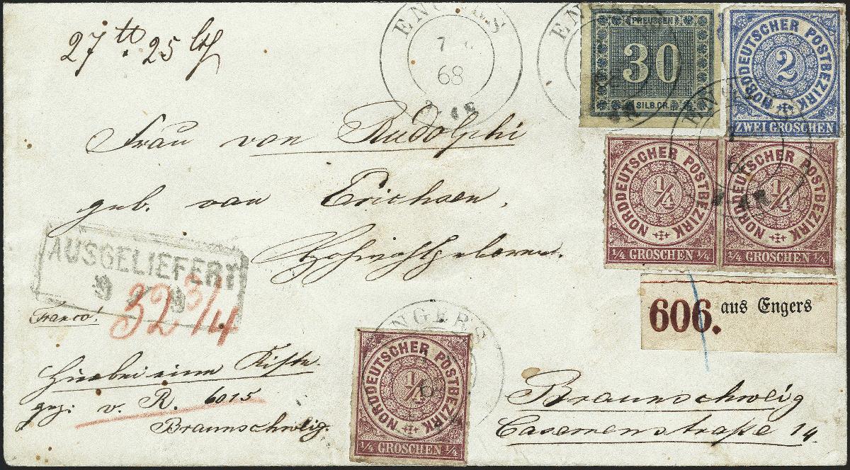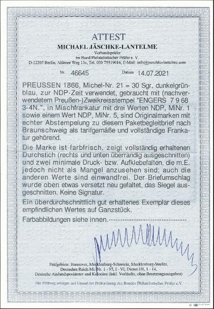 | Zusatzinformationen und Suchstichworte: | 378. Auktion Heinrich Köhler Auktionstermin 21.-26. März 2022 Los 172 30 Silbergroschen dunkelgrünblau in Mischfrankatur mit NDP 1868, ¼ Groschen violett, waagerechtes Paar und Einzelwert, sowie 2 Groschen ultramarin, alle farbfrisch und gut durchstochen, die 30 Silbergroschen teils Scherentrennung außerhalb des Durchstiches, mit klar aufgesetzten Doppelkreisstempeln „ENGERS 7/9 68“ auf Paketbegleitbrief nach Braunschweig. Ein attraktiver Brief. Fotoattest Jäschke-Lantelme BPP (2021) Ausruf 500,00 EUR Zuschlag 2.500,00 EUR (aus der Sammlung Erivan Haub) |