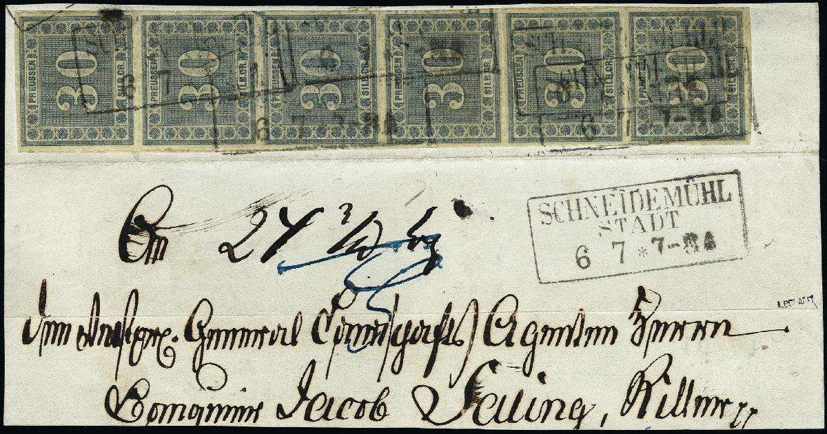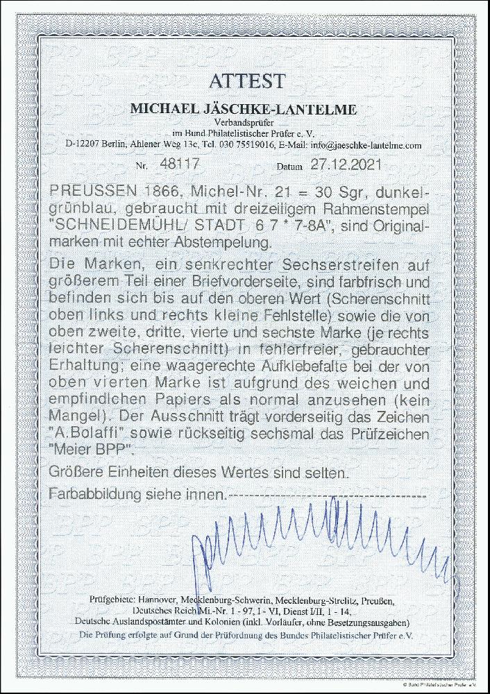| Zusatzinformationen und Suchstichworte: | 378. Auktion Heinrich Köhler Auktionstermin 21.-26. März 2022 Los 175 30 Silbergroschen dunkelgrünblau im senkrechten Sechserstreifen, farbfrisch und überwiegend gut durchstochen (teils übliche Scherentrennung und die obere Marke minimale Randkerbe rechts) mit Rahmenstempel „SCHEIDEMÜHL STADT 6 7“ auf größerem Briefstück eines Wertbriefes der Saling-Korrespondenz. Eine seltene und atttraktive Streifeneinheit. Signiert Bolaffi und Meier BPP, Fotoattest Jäschke-Lantelme BPP (2021) Ausruf 1.000,00 EUR Zuschlag 2.700,00 EUR (aus der Sammlung Erivan Haub) |