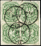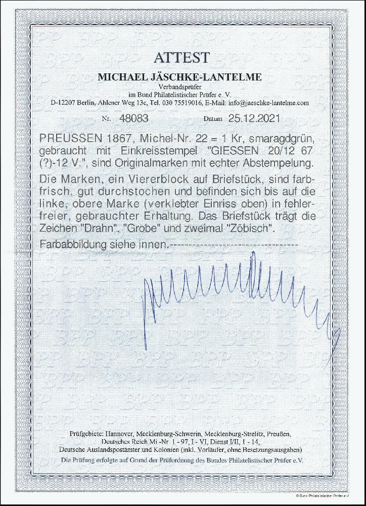 | Zusatzinformationen und Suchstichworte: | 378. Auktion Heinrich Köhler Auktionstermin 21.-26. März 2022 Los 176 1867, 1 Kreuzer grün im Viererblock, farbfrisch und gut durchstochen, mit Einkreisstempel „GIESSEN 20/12 67“ auf kleinem Briefstück. Die linke obere Marke verklebter Einriss, sonst einwandfrei. Signiert Drahn und Zöbisch, Fotoattest Jäschke-Lantelme BPP (2021) Ausruf 150,00 EUR Zuschlag 540,00 EUR (aus der Sammlung Erivan Haub) |