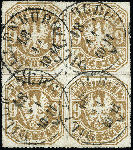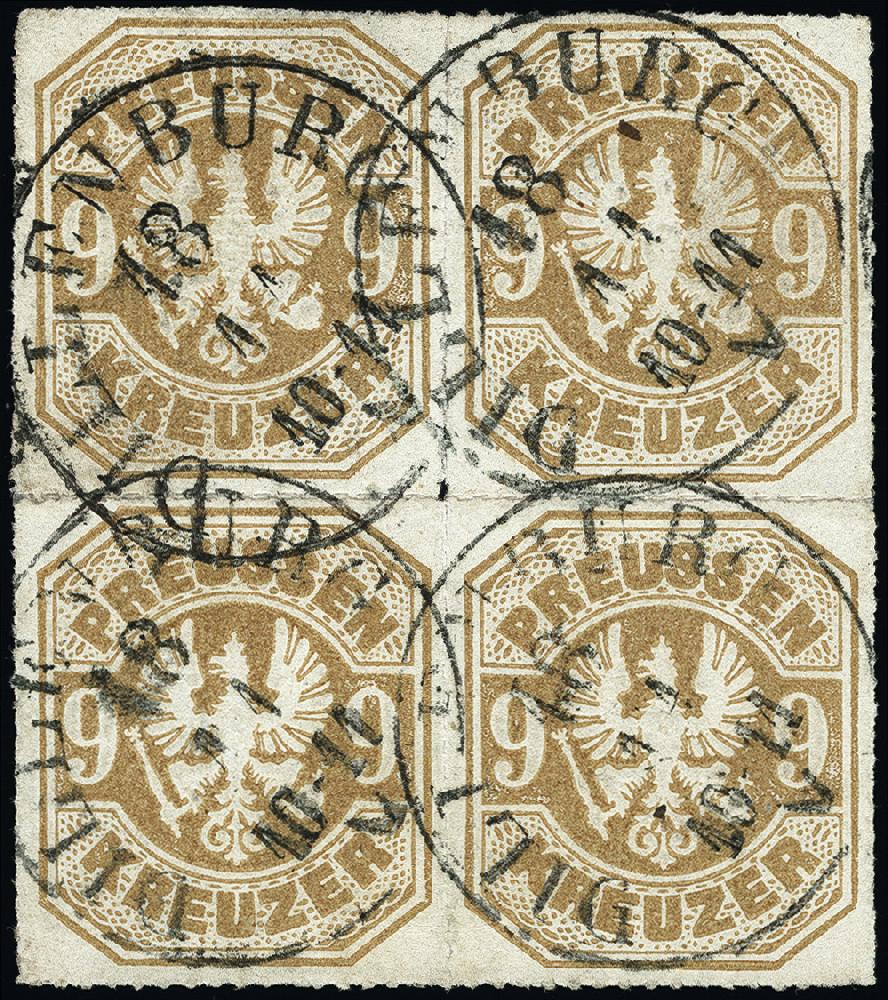 | Zusatzinformationen und Suchstichworte: | 378. Auktion Heinrich Köhler Auktionstermin 21.-26. März 2022 Los 177 9 Kreuzer ocker im Viererblock, farbfrisch und mit meist gutem Durchstich (waagerecht neu gesetzt), sauber entwertet durch Einkreisstempel „DILLENBURG 18 11 67“, kleine Randkorrektur und minimaler Papierbruch bei der linken oberen Marke, der Durchstich oben etwas an getrennt und mit Falz verstärkt. Eine seltene und attraktive Einheit. Signiert Grobe und Krause, Fotoattest Jäschke-Lantelme BPP (2022) Ausruf 150,00 EUR Zuschlag 700,00 EUR (aus der Sammlung Erivan Haub) |