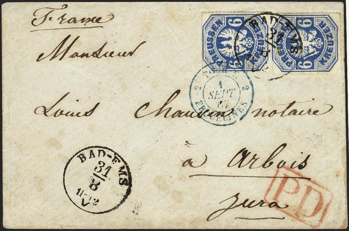 | Zusatzinformationen und Suchstichworte: | 378. Auktion Heinrich Köhler Auktionstermin 21.-26. März 2022 Los 188 6 Kreuzer ultramarin im senkrechten Paar, farbfrisch und gut durchstochen mit auf- und nebengesetztem Einkreisstempel „BAD EMS 31/8“ auf kleinem Briefkuvert nach Frankreich. Ein Wert minimaler Stockfleck, sonst einwandfrei. Fotoattest Jäschke-Lantelme BPP (2022) Ausruf 150,00 EUR Zuschlag 150,00 EUR (aus der Sammlung Erivan Haub) |
