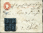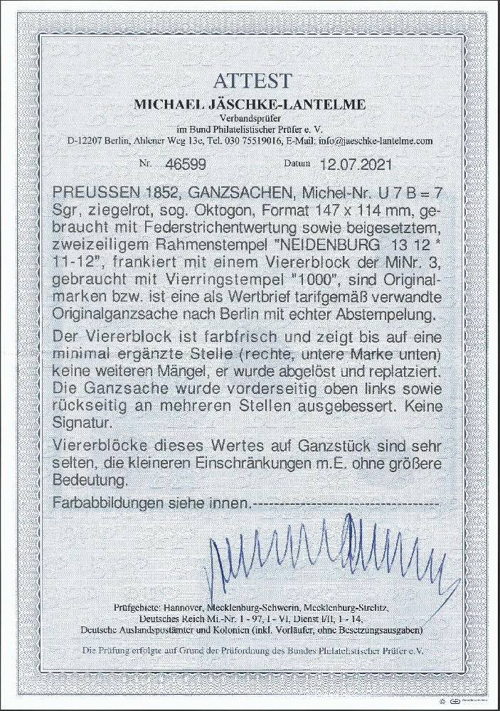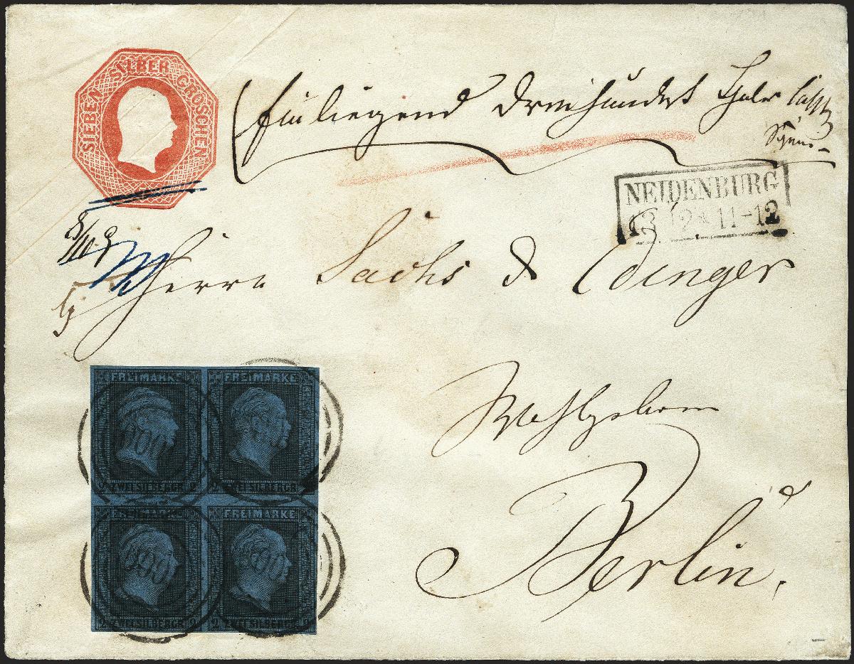 | Zusatzinformationen und Suchstichworte: | 378. Auktion Heinrich Köhler Auktionstermin 21.-26. März 2022 Los 203 Oktogon-Umschlag 7 Silbergroschen ziegelrot im Großformat mit Zufrankatur 1850, 2 Silbergroschen schwarz auf blau im Viererblock, farbfrisch, unten rechts minimale Randergänzung, sonst allseits voll-bis breitrandig, mit sauber aufgesetzter Nr. „1000“ und nebengesetztem Rahmenstempel „NEIDENBURG 13/12“ als Wertbrief mit 300 Talern nach Berlin. Die Ganzsache links oben und rückseitig an einigen Stellen unmerklich ausgebessert, sonst schöne und frische Erhaltung. Eine außerordentlich seltene und sehr attraktive Kombination; wir haben nur einen weiteren Viererblock dieser Marke auf Brief registriert. Fotoattest Jäschke-Lantelme BPP (2021) Ausruf 5.000,00 EUR Zuschlag 11.500,00 EUR (aus der Sammlung Erivan Haub) |
