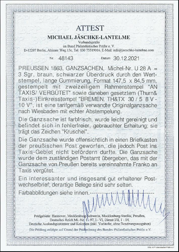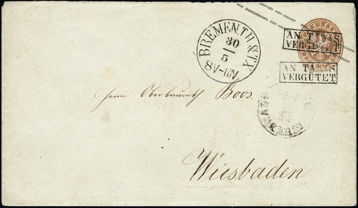 | Zusatzinformationen und Suchstichworte: | 378. Auktion Heinrich Köhler Auktionstermin 21.-26. März 2022 Los 206 1863, Umschlag 3 Silbergroschen braun, mit nebengesetztem Einkreisstempel „BREMEN TH&TX 30/5“ und zweimal auf dem Wertstempel abgeschlagenem Rahmenstempel „AN TAXIS VERGÜTET“, nach Wiesbaden mit Durchgangsstempel von Frankfurt und Ausgabestempel. Die Ganzsache ist leicht gereinigt, sonst einwandfrei. Ein interessanter und seltener Postwechsel-Brief. Signiert Kruschel, Fotoattest Jäschke-Lantelme BPP (2021) Ausruf 500,00 EUR Zuschlag 1.400,00 EUR (aus der Sammlung Erivan Haub) |