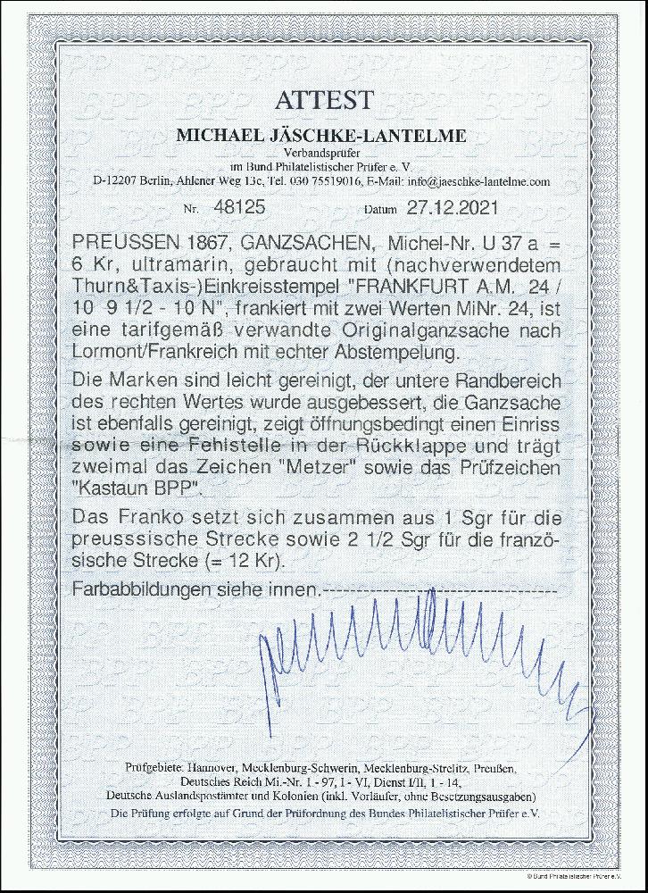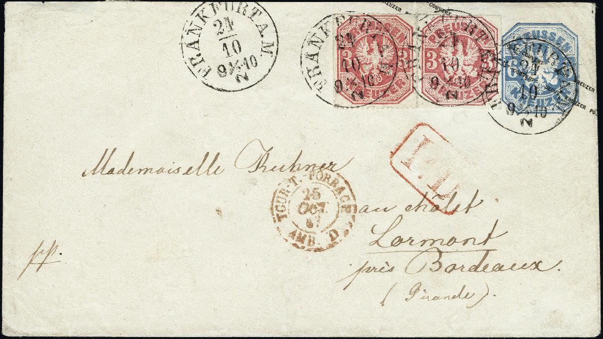 | Zusatzinformationen und Suchstichworte: | 378. Auktion Heinrich Köhler Auktionstermin 21.-26. März 2022 Los 211 1867, Umschlag 6 Kreuzer ultramarin mit Zufrankatur von zwei Einzelwerten 3 Kreuzer rosa, mit sauber auf- und nebengesetztem Einkreisstempel „FRANKFURT A.M. 24/10“ nach Frankreich mit Transit- und Ankunftsstempeln. Die Frankatur ist leicht gereinigt, der rechte Wert kleine Reparatur am Unterrand, die rückseitige Verschlussklappe nicht mehr ganz komplett, sonst einwandfreie und attraktive Erhaltung. Eine seltene Auslands Frankatur. Fotoattest Jäschke-Lantelme BPP (2021) Ausruf 300,00 EUR Zuschlag 400,00 EUR (aus der Sammlung Erivan Haub) |