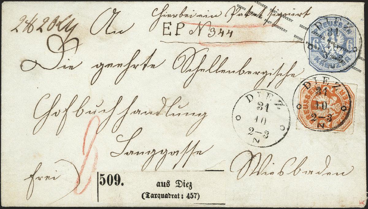 | Zusatzinformationen und Suchstichworte: | 378. Auktion Heinrich Köhler Auktionstermin 21.-26. März 2022 Los 213 1867, Umschlag 6 Kreuzer ultramarin mit Zufrankatur 2 Kreuzer orange, farbfrisch und gut durchstochen mit sauber auf- und nebengesetztem Taxis-Einkreisstempel „DIEZ 31 10“ als Paketbegleitbrief mit vorderseitigen Paketzettel nach Wiesbaden. Ein attraktiver und in dieser Form seltener Brief. Der Umschlag etwas gereinigt, sonst einwandfrei. Signiert Krause und Metzer, Fotoattest Jäschke-Lantelme BPP (2021) Ausruf 400,00 EUR Zuschlag 950,00 EUR (aus der Sammlung Erivan Haub) |