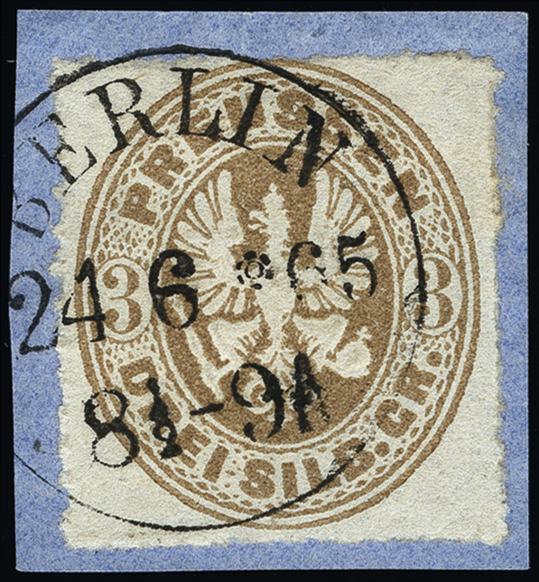 | Zusatzinformationen und Suchstichworte: | 378. Auktion Heinrich Köhler Auktionstermin 21.-26. März 2022 Los 214 „BERLIN 24 6 * 65 8½-9A“, der seltene Versuchs-Einkreisstempel in schwarz, sauber auf Wappen 3 Silbergroschen ocker auf Briefstück. Einer der seltensten Stempel der Berlin-Philatelie; es sind nur wenige lose Marken/Briefstücke, jedoch kein Ganzstück mit diesem Stempel registriert. Fotoattest Jäschke-Lantelme BPP (2021) Ausruf 500,00 EUR Zuschlag 950,00 EUR (aus der Sammlung Erivan Haub) |
