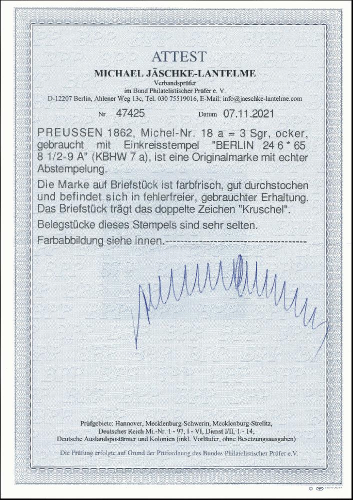 | Prüfer: | Jäschke-Lantelme, Michael (BPP (Bund Philatelistischer Prüfer)) |
