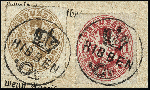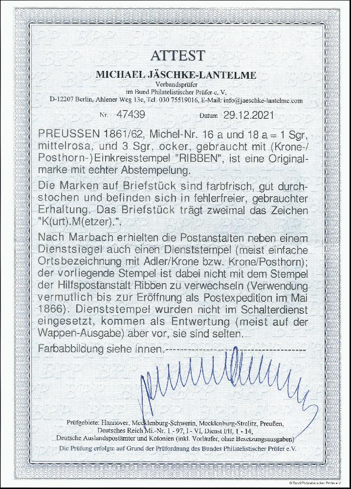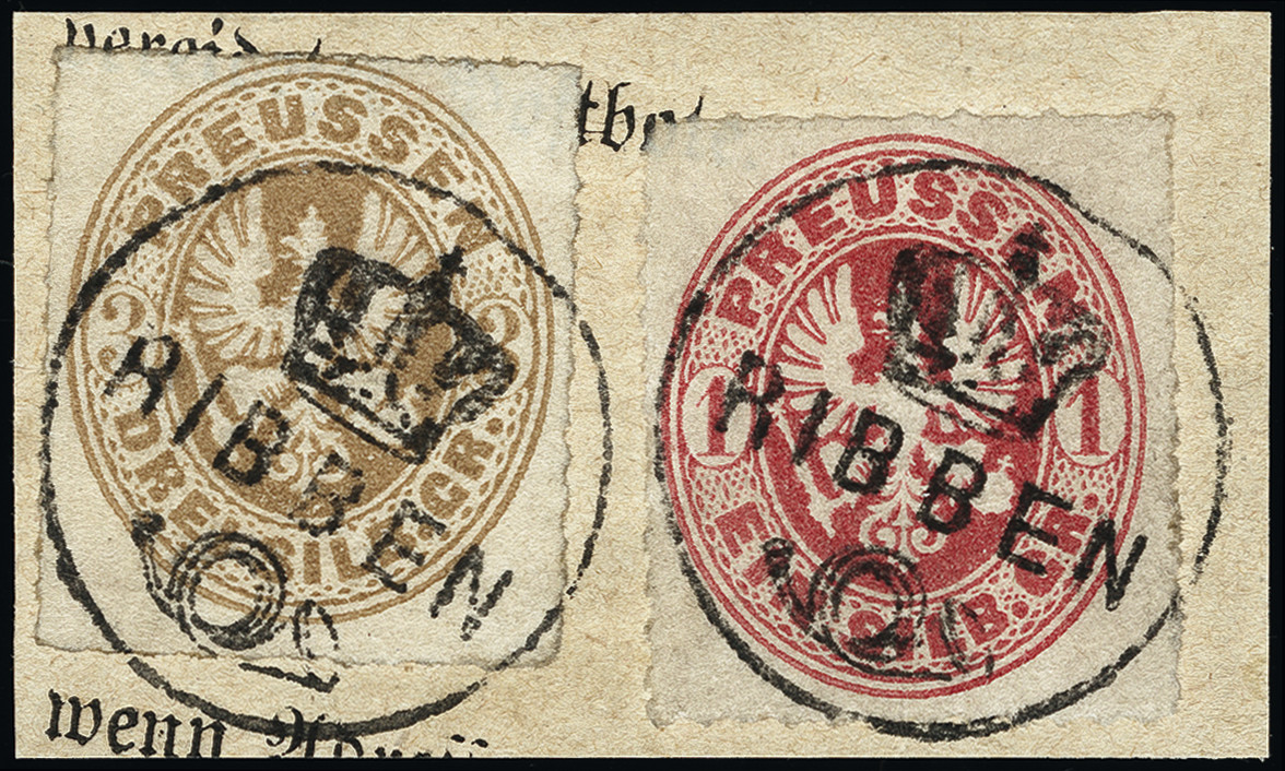 | Zusatzinformationen und Suchstichworte: | 378. Auktion Heinrich Köhler Auktionstermin 21.-26. März 2022 Los 225 „RIBBEN“, Krone-Posthorn-Stempel, jeweils klar auf Wappen 1 Silbergroschen rosa und 3 Silbergroschen ocker, farbfrisch und einwandfrei durchstochen auf kleinem Briefstück eines Insinuationsdokumentes. Kabinett. Fotoattest Jäschke-Lantelme BPP (2021) Ausruf 500,00 Zuschlag 1.100,00 EUR (aus der Sammlung Erivan Haub) |