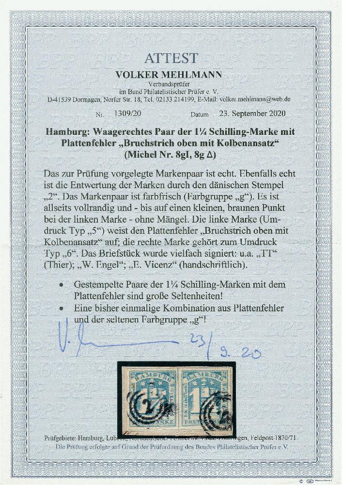 | Zusatzinformationen und Suchstichworte: | 375. Auktion Heinrich Köhler Auktionstermin 16.-21. November 2021 Los 4347 1¼ Sch. stumpfblau im waagerechten paar, die linke Marke mit 'Kolbenansatz', farbfrisch und allseits breitrandig, mit Nr. "2" auf Briefstück die linke Marke mit kleinem Fleck, sonst tadellos. Wir haben kein weiteres Paar dieser seltenen Farbe registriert, mit dem Plattenfehler ein sensationelles Stück. Fotoattest Mehlmann BPP (2020) Zuschlag 2.800,00 EUR |