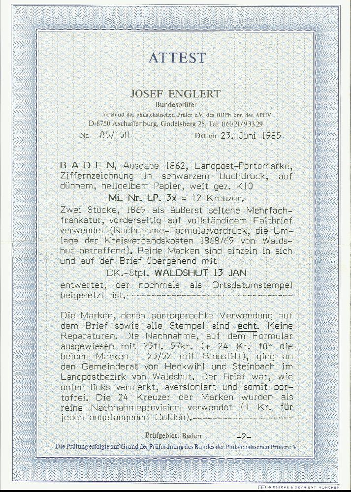 | Prüfgebiet: | Altdeutschland Baden Landpost-Portomarken |