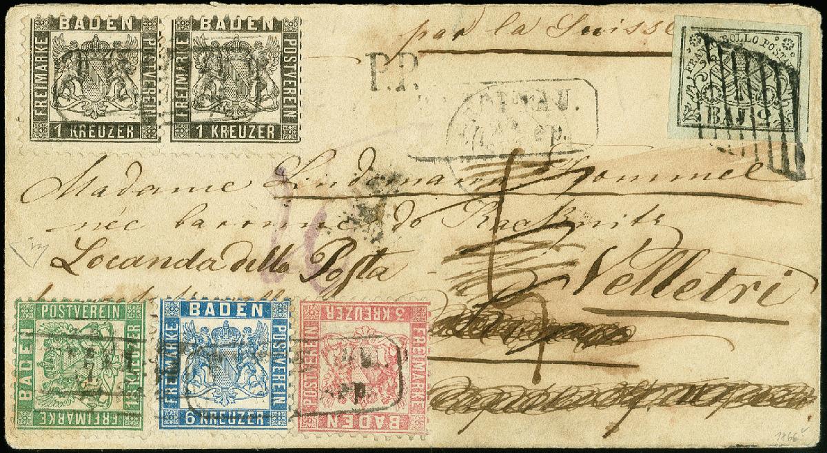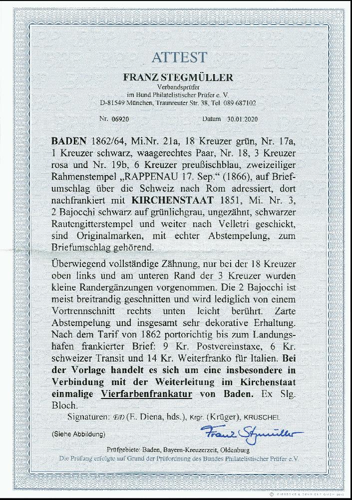 | Zusatzinformationen und Suchstichworte: | 375. Auktion Heinrich Köhler Auktionstermin 16.-21. November 2021 Los 4222 18 Kr. grün, 1 Kr. schwarz im waagerechten Paar, 3 Kr. rosa und 6 Kr. preußischblau mit Ra. "RAPPENAU 17 Sep." (1866) auf Briefkuvert über die Schweiz nach Rom, korrekt frankiert mit 9 Kreuzern Vereinstaxe, 6 Kreuzern Schweizer Transit und 14 Kreuzern Weiterfranko bis zur Grenze des Kirchenstaates; die dortige Inlandsgebühr von "5" Bajocchi wurde vom Empfänger eingezogen. Der Brief wurde innerhalb des Kirchenstaates nachgesandt nach Velletri, frankiert mit 1851, 2 Bajocchi auf grünlichgrau. Bei der 18 Kr. links oben einige Zähne ergänzt, sowie am unteren Rand der 3 Kreuzer kleine Randergänzungen vorgenommen, sonst gute Erhaltung. Eine attraktive und außerordentlich seltene Kombinationsfrankatur. Signiert Bloch, Krüger und Kruschel, Fotoatteste Enzo Diena (1991) und Stegmüller BPP (2020) Zuschlag 7.000,00 EUR |