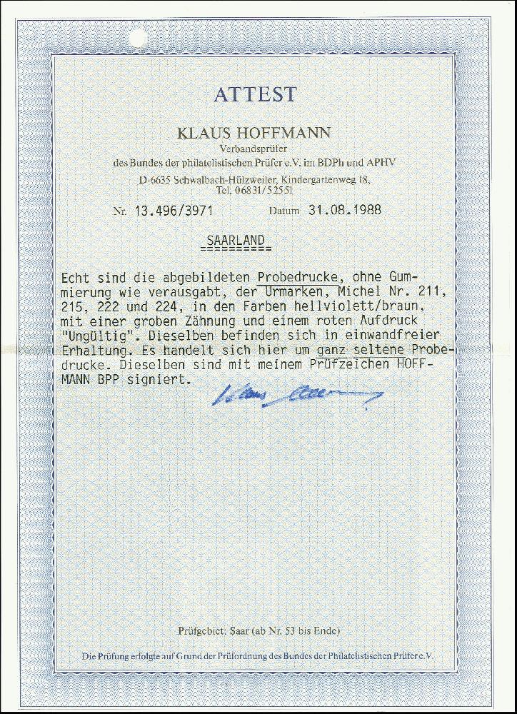 | Prüfgebiet: | Saarland (ab Mi-Nr. 206) |