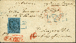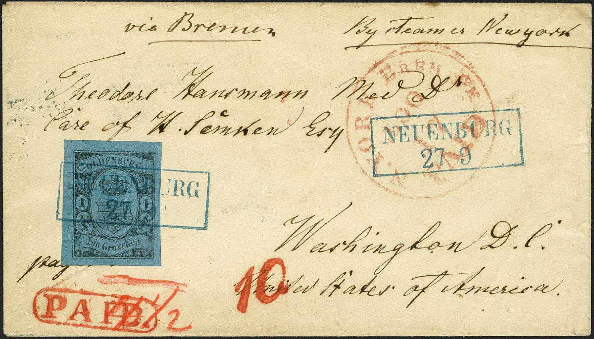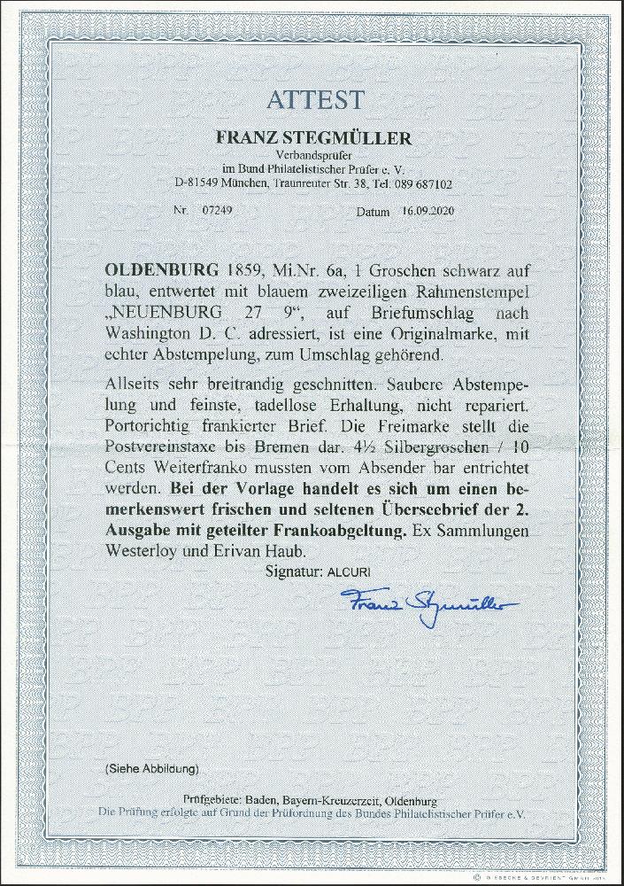 | Zusatzinformationen und Suchstichworte: | 375. Auktion Heinrich Köhler Auktionstermin 16.-21. November 2021 Los 114 1859, 1 Groschen schwarz auf blau, farbfrisch und allseits breitrandig mit sauber auf- und nebengesetztem blauen Rahmenstempel "NEUENBURG 27 9" auf kleinem Briefkuvert über Bremen nach Washington D.C. mit vorderseitigem roten "N.YORK BREM.PK. PAID". Der Brief ist mit 5½ Silbergroschen vollständig bezahlt, jedoch nur das Inlandsporto frankiert, "4½" Silbergroschen in bar verrechnet. Ein sehr schöner und seltener Brief mit "Geteiltem Franko". Fotoattest Stegmüller BPP (2020) Zuschlag 18.000,00 EUR |