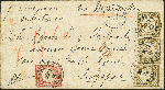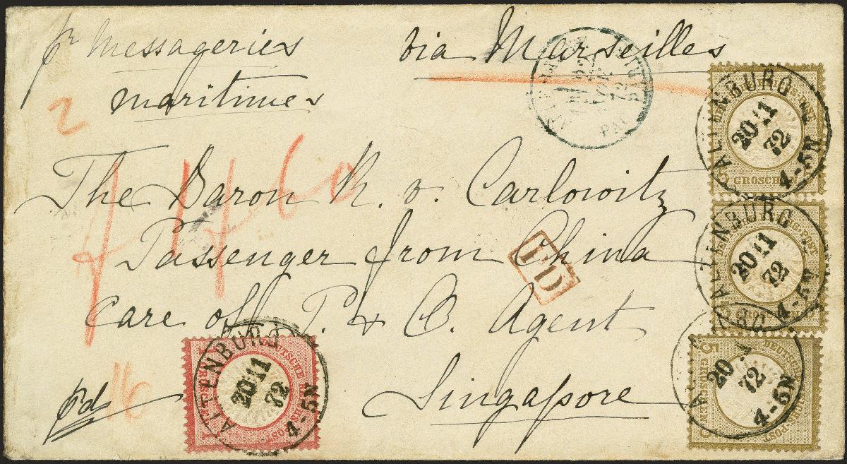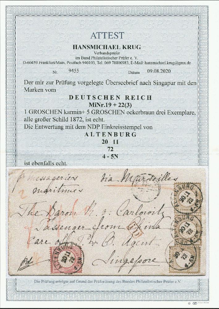 | Zusatzinformationen und Suchstichworte: | 375. Auktion Heinrich Köhler Auktionstermin 16.-21. November 2021 Los 262 1 Groschen karmin und drei Exemplare 5 Groschen ockerbraun mit Einkreisstempel "ALTENBURG 20 11 72" auf Brief der 2. Gewichtsstufe über Frankreich nach Singapur an den Baron von Carlowitz mit rückseitigem Einkreisstempel "SINGAPORE A DE 24" als Ankunftsstempel. Nach Singapur sind bisher nur zwei Briefe mit Brustschildfrankaturen bekannt. Fotoattest Krug BPP (2020) Zuschlag 29.000,00 EUR |