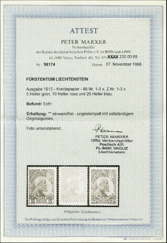 | Zusatzinformationen und Suchstichworte: | 366. Auktion Heinrich Köhler Auktionstermin 19.–24.03.2018 Los 2 1912, Fürst Johann II. 5-25 H. auf gestrichenem Papier, postfrisch, Kabinett, Fotoattest Marxer BPP (1998) Zuschlag 160,00 EUR |