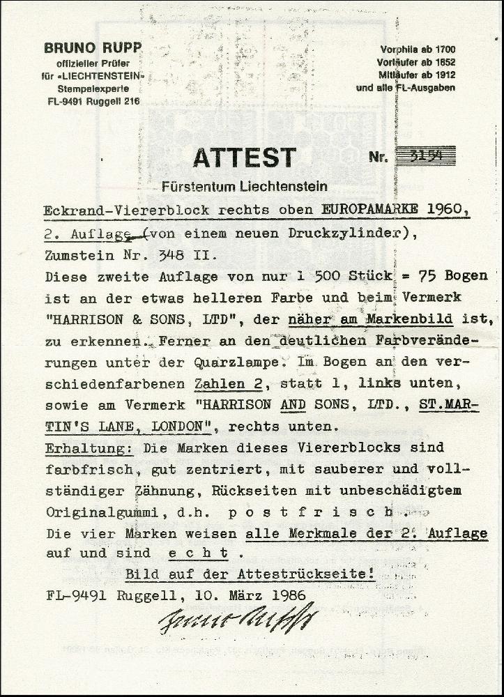 | Zusatzinformationen und Suchstichworte: | 366. Auktion Heinrich Köhler Auktionstermin 19.–24.03.2018 Los 5 1960, CEPT 50 Rp., Type II (Nachauflage) aus der rechten oberen Bogenecke, postfrisch, tadellos, Fotokopie Fotoattest Rupp für einen ehemaligen Viererblock (Mi. 1.700,-) Zuschlag 350,00 EUR |