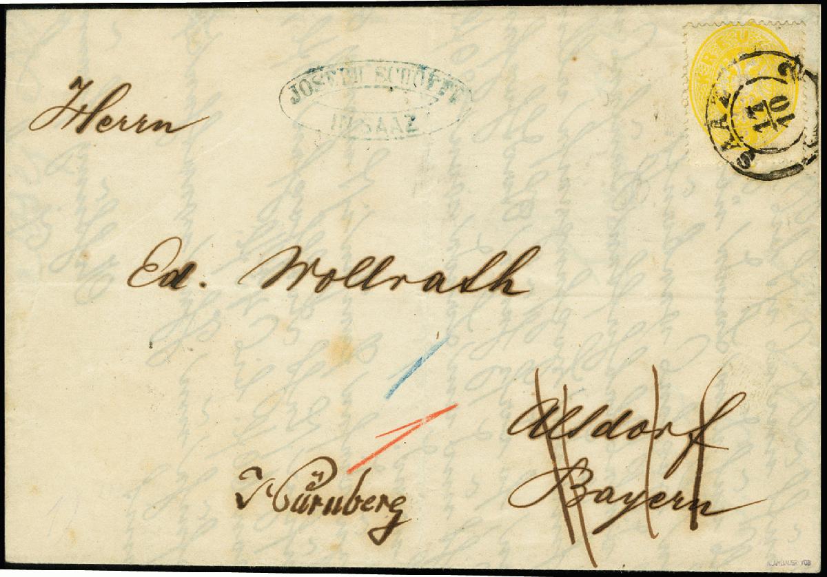 | Zusatzinformationen und Suchstichworte: | 366. Auktion Heinrich Köhler Auktionstermin 19.–24.03.2018 Los 8 1863, 2 Kr. gelb, farbfrisch und gut gezähnt mit DKr. "SAAZ 17/10" auf kpl. Drucksache im Wechselverkehr nach Altdorf und nachgesandt nach Nürnberg; sign. Klambauer VÖB mit Befund (1982) Zuschlag 80,00 EUR |