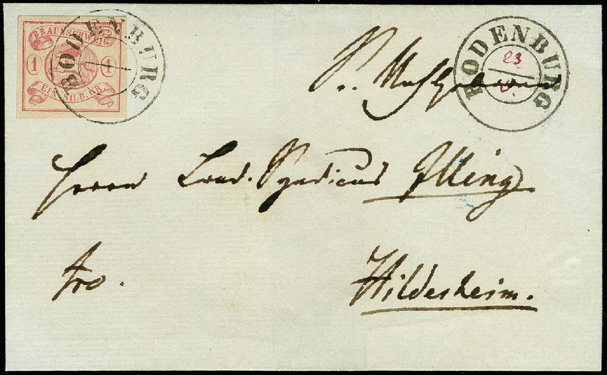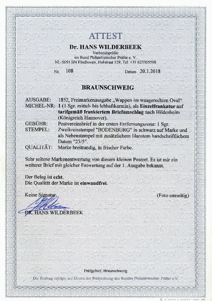 | Zusatzinformationen und Suchstichworte: | 366. Auktion Heinrich Köhler Auktionstermin 19.–24.03.2018 Los 8013 1 Silbergroschen karmin, allseits breitrandig und sehr schön farbfrisch, mit klar auf- und zusätzlich nebengesetztem Doppelkreisstempel "BODENBURG", der nebengesetzte mit handschriftlichem Datum "23.5" auf Briefhülle nach Hildesheim mit rückseitigem Ausgabestempel. Ein traumhaft schöner Brief und einer von 2 bekannten Markenbriefen mit dieser Entwertung Zuschlag 9.000,00 EUR |