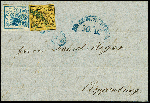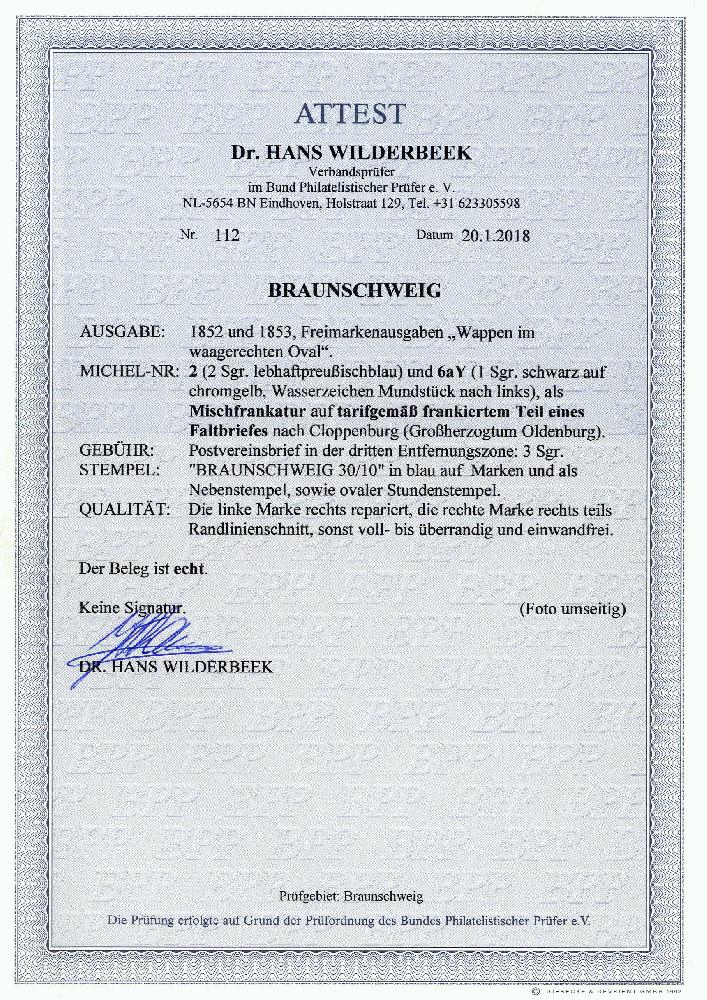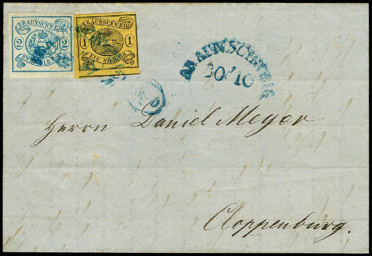 | Zusatzinformationen und Suchstichworte: | 366. Auktion Heinrich Köhler Auktionstermin 19.–24.03.2018 Los 8022 2 Silbergroschen preußischblau, dreiseitig breitrandig, rechts mit Randkorrektur, in Mischfrankatur mit 1 Silbergroschen auf sämisch mit spiegelverkehrtem Wasserzeichen, rechts an der Randlinie geschnitten, sonst voll- bis überrandig, mit blauem Halbkreisstempel "BRAUNSCHWEIG 30/10" auf rückseitig nicht kompletter Briefhülle nach Cloppenburg in Oldenburg; leichte Briefbüge außerhalb der Frankatur, ein attraktiver Brief mit seltener Mischfrankatur Ausruf 500,00 EUR |
