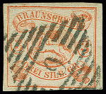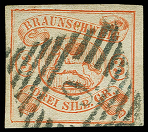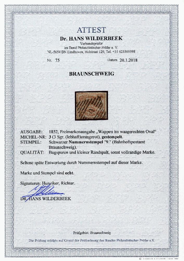 | Zusatzinformationen und Suchstichworte: | 366. Auktion Heinrich Köhler Auktionstermin 19.–24.03.2018 Los 8029 3 Silbergroschen orangerot, voll- bis breitrandig mit sauber aufgesetztem Nummernstempel "9" des Braunschweiger Bahnhofspostamtes; winziger bzw. unmerklicher Randspalt am Unterrand und unmerkliche Bugspuren, sonst einwandfrei; eine sehr seltene Entwertung auf dieser Marke, wir haben kein weiteres Exemplar mit Nummernstempelentwertung registriert Zuschlag 700,00 EUR |