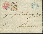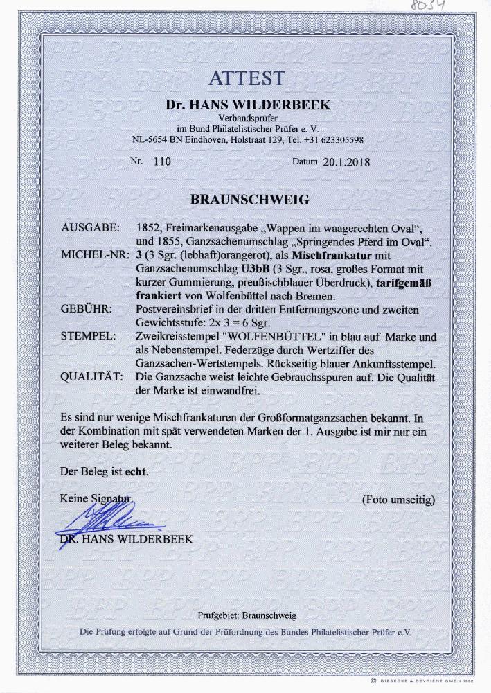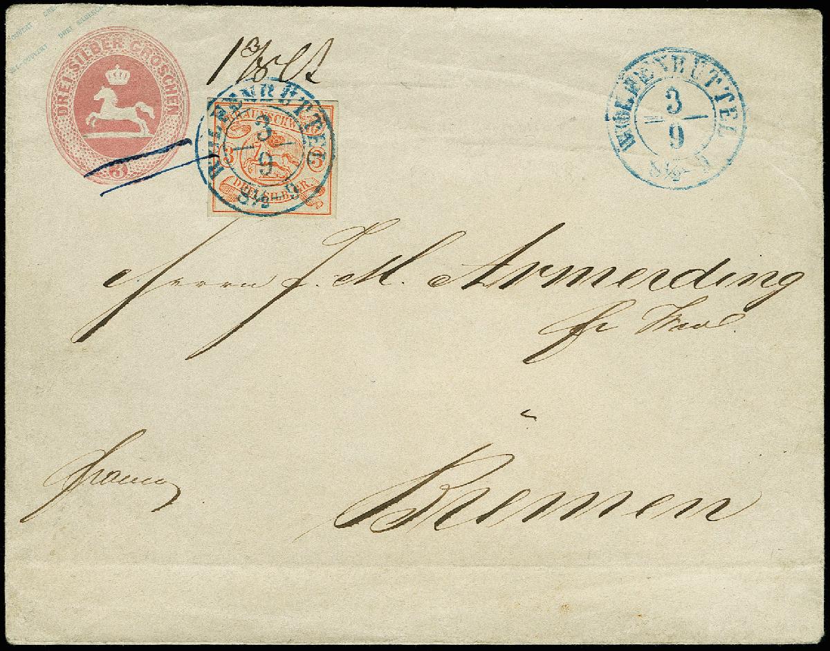 | Zusatzinformationen und Suchstichworte: | 366. Auktion Heinrich Köhler Auktionstermin 19.–24.03.2018 Los 8034 3 Silbergroschen orangerot in lebhaft leuchtender Farbe und allseits breitrandig, mit sauber auf- und zusätzlich nebengesetztem blauen Doppelkreisstempel "WOLFENBÜTTEL 3/9" als Zufrankatur auf Ganzsachenumschlag 3 Silbergroschen rosa im Großformat als Brief der 2. Gewichtsstufe nach Bremen mit schwachem Ankunftsstempel; der Umschlag mit leichten Knitterspuren und waagerechter Bugspur am Unterrand, die Marke tadellos. Diese Kombination von Marke und Umschlag ist einmalig; wir haben überhaupt nur eine einzige weitere Kombination mit Marken der 1. Ausgabe auf Ganzsachenumschlag registriert, eine große Seltenheit der Braunschweig-Philatelie Zuschlag 8.500,00 EUR |