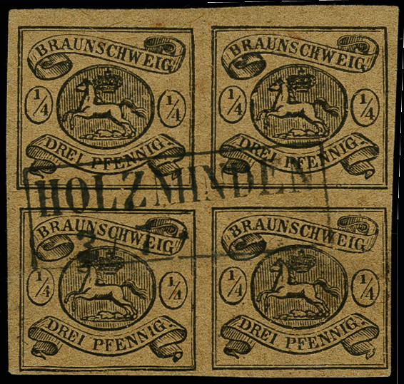 | Zusatzinformationen und Suchstichworte: | 366. Auktion Heinrich Köhler Auktionstermin 19.–24.03.2018 Los 8037 ¼ Groschen auf braunem Kartonpapier, 4er-Block, allseits voll- bis breitrandig mit zentrisch sauber aufgesetztem Rahmenstempel "HOLZMINDEN 3/7"; das untere Paar schwache Bugspur, sonst einwandfrei; eine - insbesondere mit der Ortsstempelentwertung - seltene Einheit Zuschlag 650,00 EUR |