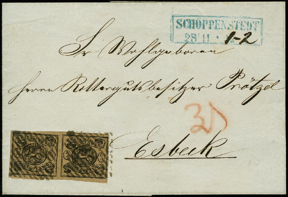 | Zusatzinformationen und Suchstichworte: | 366. Auktion Heinrich Köhler Auktionstermin 19.–24.03.2018 Los 8038 ¼ Gutegroschen auf braun im waagerechten Paar, voll- bis breitrandig mit sauber aufgesetzter Nr. "38" und nebengesetztem Rahmenstempel "SCHÖPPENSTEDT 28/11" (handschriftlich korrigierte Stunde) auf Briefhülle nach Esbeck; der Brief wurde am Postamt abgeholt, daher anstatt des Landpostbestellgeldes nur "3" Gutepfennig Ortsbestellgeld erhoben und vorderseitig in rot notiert; schöne Frankatur in einwandfreier Erhaltung Zuschlag 700,00 EUR |
