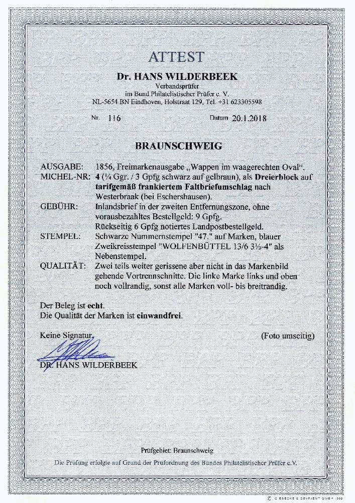 | Zusatzinformationen und Suchstichworte: | 366. Auktion Heinrich Köhler Auktionstermin 19.–24.03.2018 Los 8042 ¼ Gutegroschen auf braun im 3er-Block, voll- bis breitrandig mit klarer Nr. "47" und nebengesetztem blauen Doppelkreisstempel "WOLFENBÜTTEL 13/6" auf Briefhülle nach Westerbraak bei Eschershausen mit rückseitig notiertem Landpostbestellgeld von "6" Gutepfennigen; die Einheit mit zwei Vortrennschnitten, nicht ins Markenbild reichend; ein attraktiver Brief in einwandfreier Erhaltung, wir haben keinen weiteren 3er-Block dieser Marke auf Brief registriert Zuschlag 550,00 EUR |