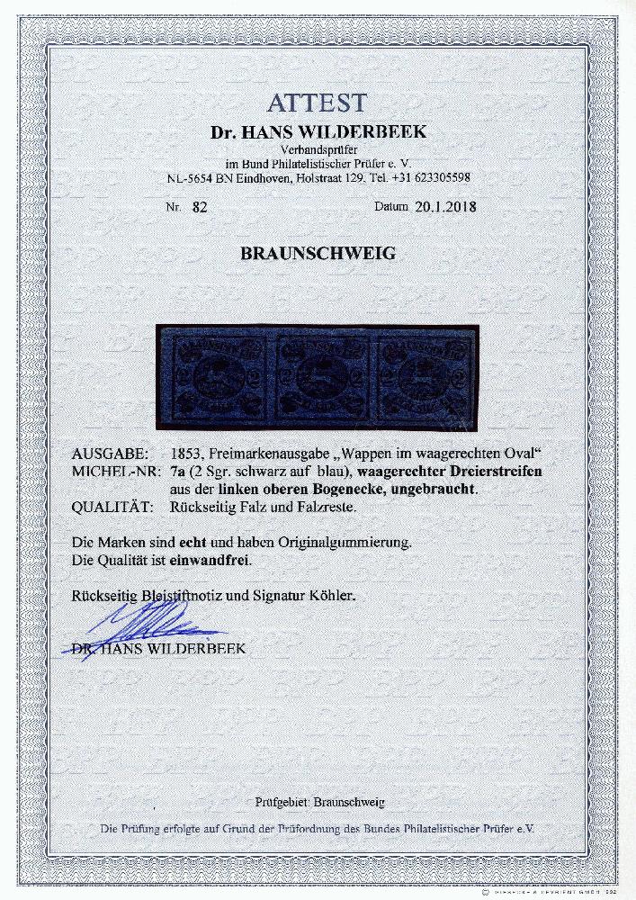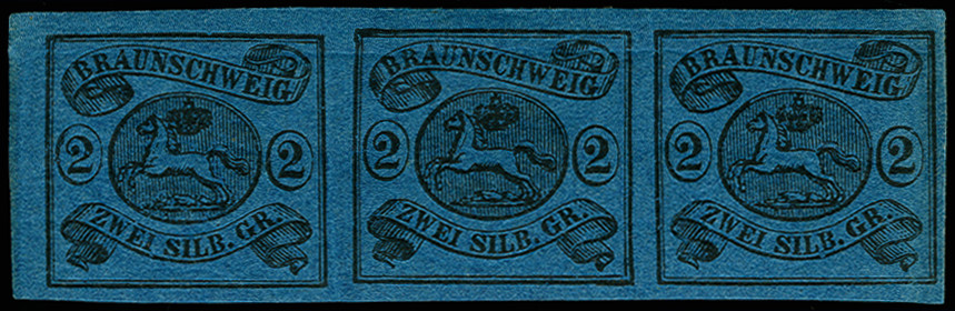 | Zusatzinformationen und Suchstichworte: | 366. Auktion Heinrich Köhler Auktionstermin 19.–24.03.2018 Los 8057 2 Silbergroschen auf blau im waagerechten 3er-Streifen, farbfrisch und gut voll- bis meist breitrandig, aus der linken oberen Bogenecke, ungebraucht mit Originalgummi; eine sehr seltene Einheit in einwandfreier Erhaltung Zuschlag 1.050,00 EUR |