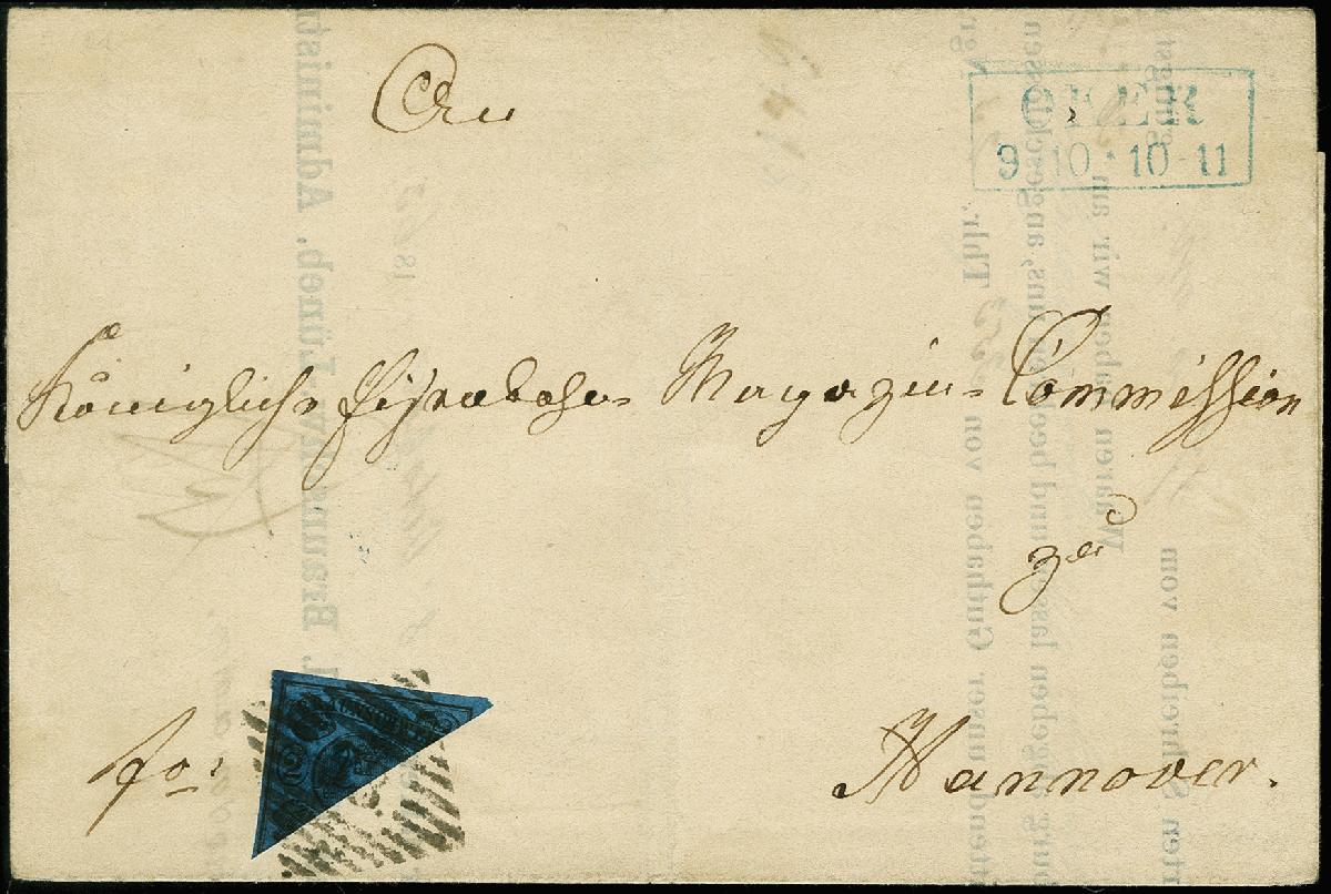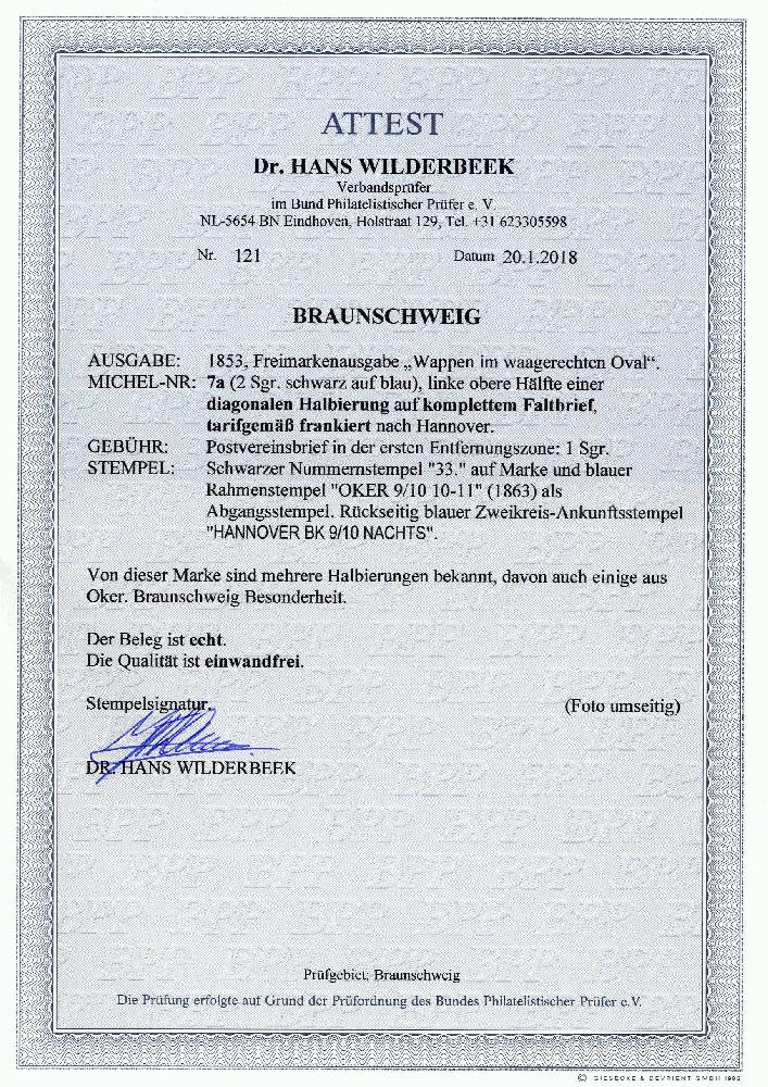 | Zusatzinformationen und Suchstichworte: | 366. Auktion Heinrich Köhler Auktionstermin 19.–24.03.2018 Los 8066 2 Silbergroschen auf blau diagonal halbiert, linke obere Hälfte, farbfrisch und voll- bis breitrandig mit sauber aufgesetztem Nummernstempel "43" und nebengesetztem Rahmenstempel "OKER 9/10" (1863) auf komplettem Faltbrief nach Hannover; ein sehr schönes Stück in einwandfreier Erhaltung. Dies ist die einzig registrierte diagonale Halbierung von Oker, ansonsten sind von diesem Ort nur die wenigen bekannten senkrechten Halbierungen bekannt Zuschlag 5.700,00 EUR |