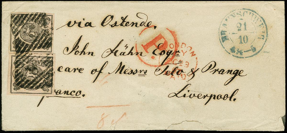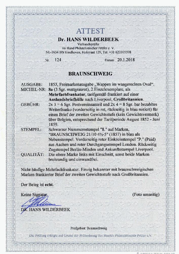 | Zusatzinformationen und Suchstichworte: | 366. Auktion Heinrich Köhler Auktionstermin 19.–24.03.2018 Los 8072 3 Silbergroschen auf graurot, 2 Einzelwerte, bei voll- bis breitrandig mit Nr. "8" und nebengesetztem blauen Doppelkreisstempel "BRAUNSCHWEIG 21/10" (1857) auf kleinem Briefkuvert der 2. Gewichtsstufe nach Liverpool; der Brief ist bis zum Bestimmungsort bezahlt mit insgesamt 14 Groschen, davon wurde der Auslandsanteil bar bezahlt und ist vorder- und rückseitig mit "8" Groschen vermerkt; ein Wert bereits mit kleinem Einschnitt links aufgeklebt, das Kuvert unten leicht Öffnungsmängel, sonst einwandfrei. Dies ist der einzig bekannte mit braunschweigischen Marken frankierte Brief der 2. Gewichtsstufe nach Großbritannien Zuschlag 900,00 EUR |