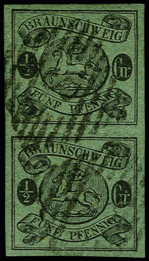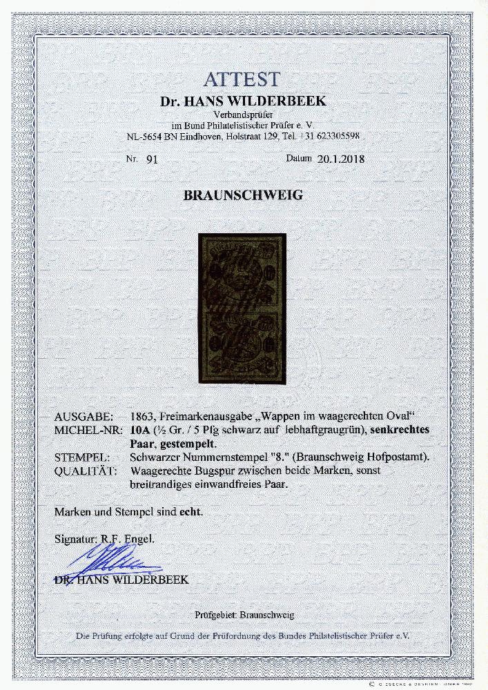 | Zusatzinformationen und Suchstichworte: | 366. Auktion Heinrich Köhler Auktionstermin 19.–24.03.2018 Los 8090 ½ Groschen auf grün im senkrechten Paar, allseits breitrandig, sauber entwertet durch Nr. "8" von Braunschweig; zwischen den Werten leichte Vorfaltung, sonst tadellos Zuschlag 270,00 EUR |
