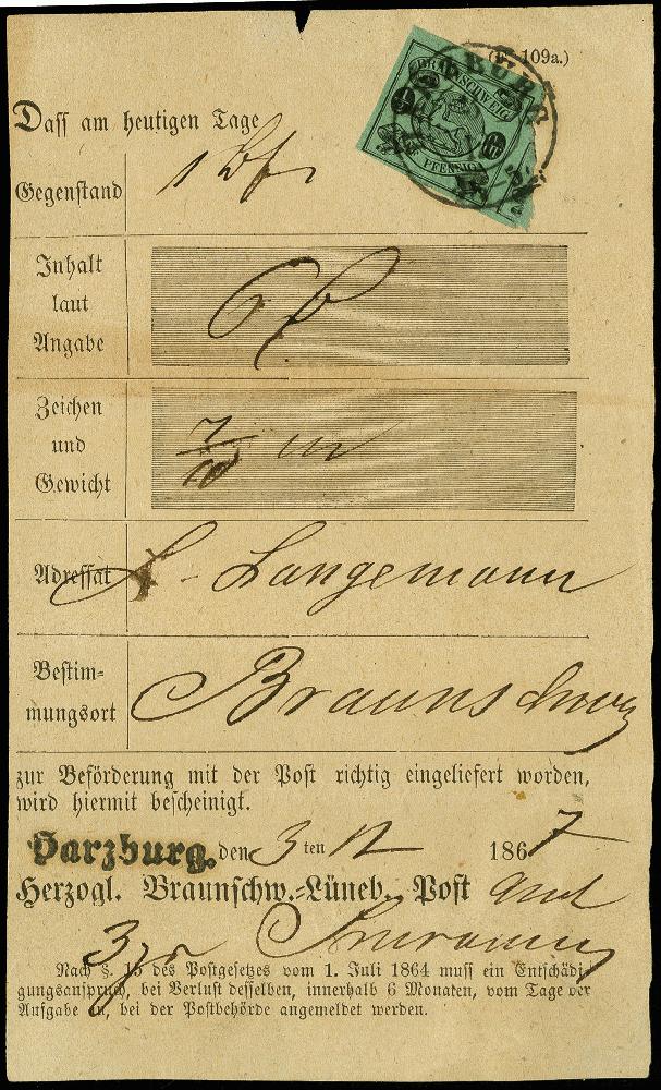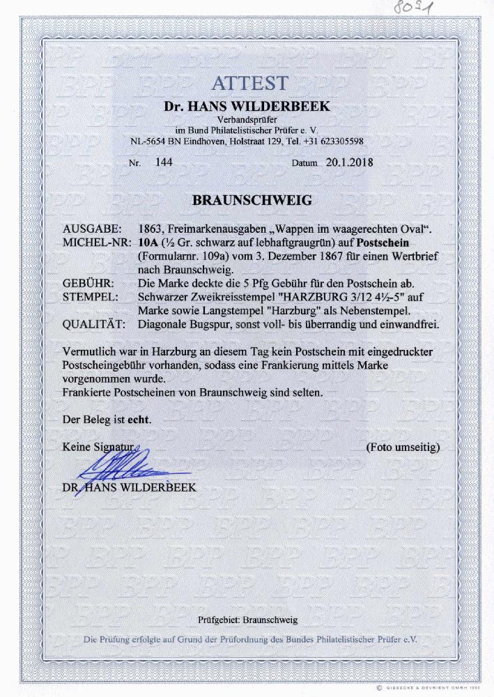 | Zusatzinformationen und Suchstichworte: | 366. Auktion Heinrich Köhler Auktionstermin 19.–24.03.2018 Los 8091 ½ Groschen auf grün, voll- bis überrandig mit Teil der rechten Nachbarmarke, mit sauber aufgesetztem Doppelkreisstempel "HARZBURG 3 12" (1867) auf Postschein für einen Wertbrief nach Braunschweig; die Marke leichte Bugspur, das Formular oben kleine Fehlstelle, sonst einwandfrei. Diese Einzelfrankatur ist auf Postschein außerordentlich selten, wir haben insgesamt 7 derartige Frankaturen registriert, davon ist dies die einzige mit Ortsstempelentwertung und die einzige aus Harzburg; sehr schönes Stück Zuschlag 900,00 EUR |