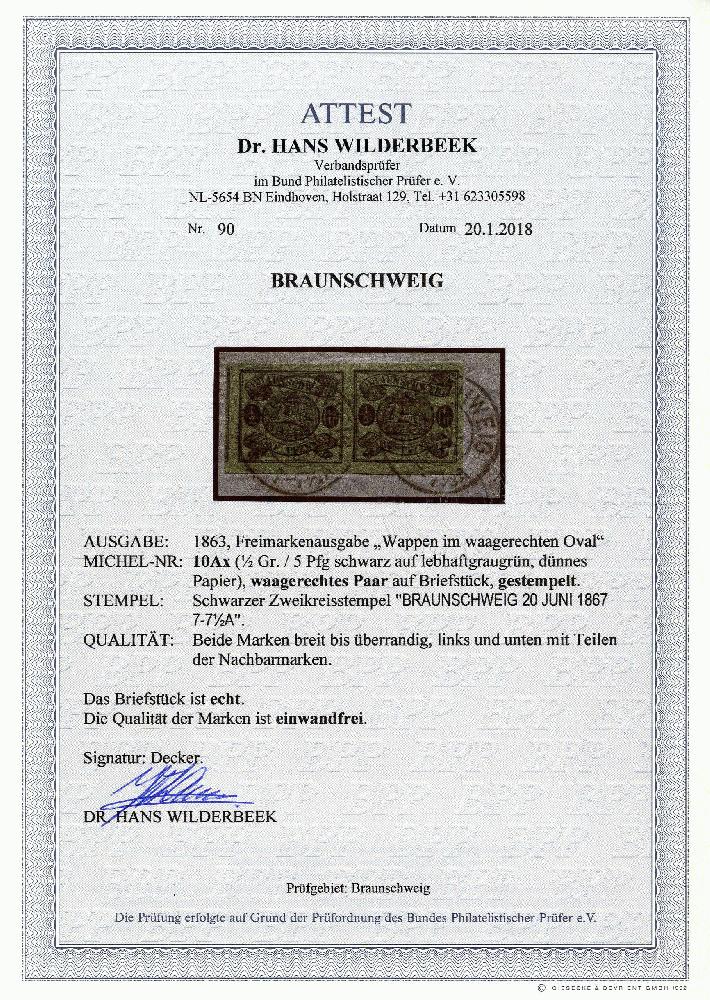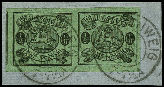 | Zusatzinformationen und Suchstichworte: | 366. Auktion Heinrich Köhler Auktionstermin 19.–24.03.2018 Los 8094 ½ Groschen auf grün, dünnes Papier, im waagerechten Paar, breit- bis überrandig, links mit Teil der Nachbarmarke, mit zweimal klar aufgesetztem Doppelkreisstempel "BRAUNSCHWEIG 20 JUNI 1867" auf Briefstück, Luxus Zuschlag 1.100,00 EUR |