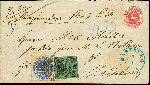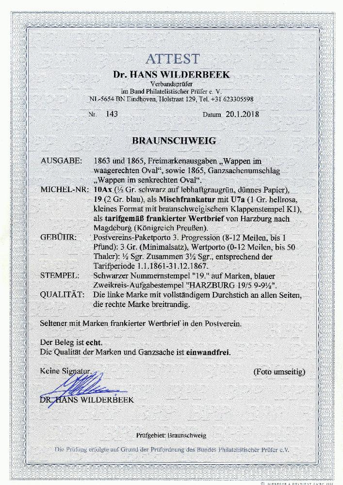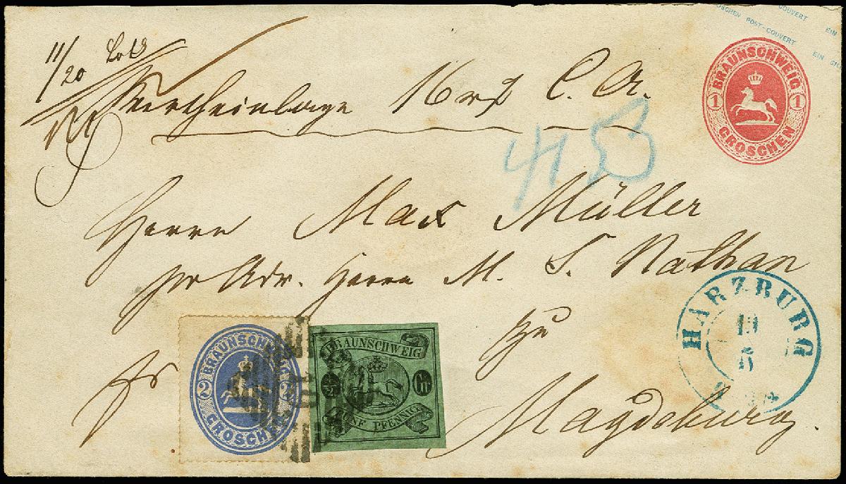 | Zusatzinformationen und Suchstichworte: | 366. Auktion Heinrich Köhler Auktionstermin 19.–24.03.2018 Los 8095 ½ Groschen auf grün, allseits breitrandig in Mischfrankatur mit 1865, 2 Groschen blau, allseits einwandfrei durchstochen, mit Nr. "19" als Zufrankatur auf Ganzsachenumschlag 1 Silbergroschen rosa mit nebengesetztem blauen Doppelkreisstempel "HARZBURG 19/5" als gesiegelter Wertbrief nach Magdeburg; die rückseitigen Siegel teils leicht durchschlagend, sonst einwandfrei; eine äußerst seltene und attraktive frankierte Fahrpostsendung Zuschlag 6.500,00 EUR |