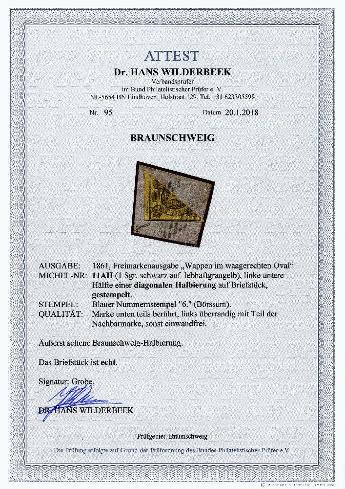 | Zusatzinformationen und Suchstichworte: | 366. Auktion Heinrich Köhler Auktionstermin 19.–24.03.2018 Los 8105 1 Silbergroschen auf gelb, diagonal halbiert, linke untere Hälfte, unten in der Randlinie leicht berührt, rechts mit kleinem Teil der Nachbarmarke, mit blauem Nummernstempel "6" von Börssum auf Briefstück (Ecke rechts unten über den Rand geklebt), ein sehr seltenes Stück in insgesamt guter Erhaltung Zuschlag 1.400,00 EUR |