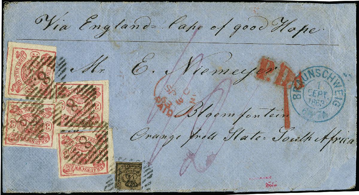 | Zusatzinformationen und Suchstichworte: | 366. Auktion Heinrich Köhler Auktionstermin 19.–24.03.2018 Los 8108 3 Silbergroschen auf rosa, 4 Einzelstücke, eine unten leicht berührt, sonst alle voll- bis breitrandig und jeweils mit bis zu 3 mm linkem Bogenrand, zusammen mit Inlandsmark ¼ Gutegroschen auf braun (eine weitere 2 Groschen-Marke abgefallen) mit Nr. "8" und nebengesetztem Doppelkreisstempel "BRAUNSCHWEIG 1 SEPT. 1863" auf Leinenkuvert über London nach Bloemfontein im Oranje Freistaat, Südafrika. Der Brief war bis zum Bestimmungsort bezahlt und frankiert, in England vorderseitig "1/2" notiert und Verrechnungsstempel "1 d" für die Colonial Fee angebracht; ein attraktiver Brief mit außerordentlich seltener Destination aus der bekannten Niemeier-Korrespondenz Zuschlag 1.200,00 EUR |