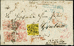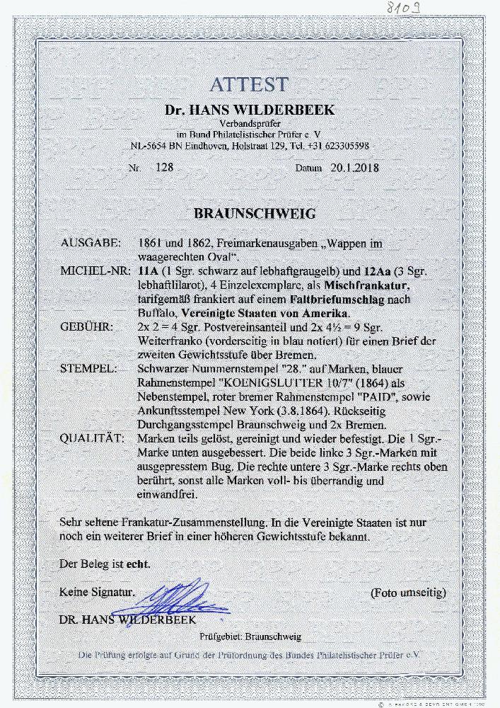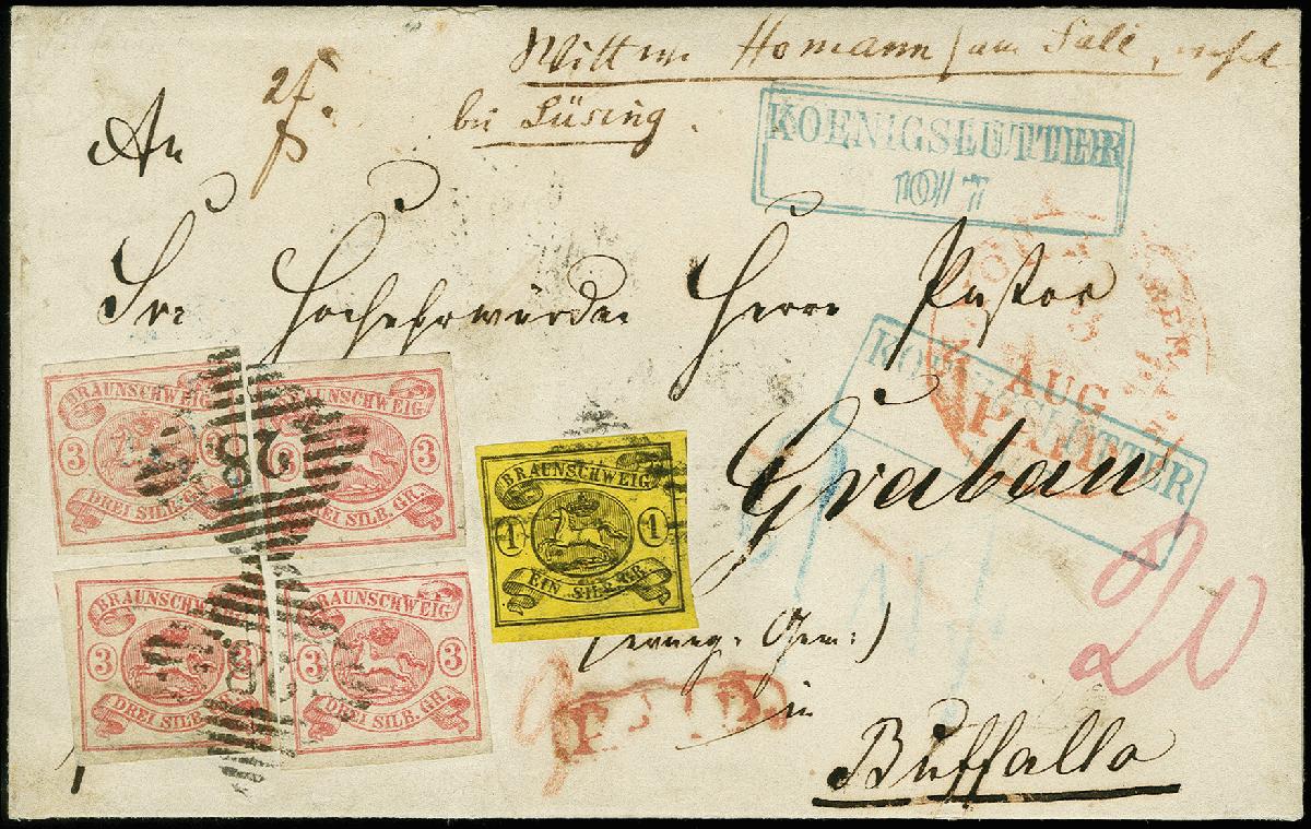 | Zusatzinformationen und Suchstichworte: | 366. Auktion Heinrich Köhler Auktionstermin 19.–24.03.2018 Los 8109 3 Silbergroschen mattrosa, 4 Einzelwerte, eine kurz berührt, sonst alle voll- bis sehr breitrandig, zusammen mit 1 Silbergroschen auf gelb, Unterrand ausgebessert, sonst allseits breitrandig, mit Nr. "28" und nebengesetztem Rahmenstempel "KÖNIGSLUTTER 10/7" (1864) auf Briefhülle der 2. Gewichtsstufe über Bremen nach Buffalo in den Vereinigten Staaten von Amerika; der Umschlag etwas gereinigt, bei den beiden linken Werten senkrechte Bugspur geglättet (praktisch unsichtbar). Ein sehr attraktiver und außerordentlich seltener Transatlantik-Brief; wir haben keinen weiteren der 2. Gewichtsstufe registriert; es existiert ein Brief der 3. Gewichtsstufe jedoch in Mischfrankatur mit der letzten Ausgabe Zuschlag 8.500,00 EUR |