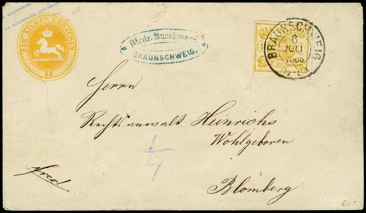 | Zusatzinformationen und Suchstichworte: | 366. Auktion Heinrich Köhler Auktionstermin 19.–24.03.2018 Los 8115 1 Silbergroschen durchstochen 16, allseits tadellos, oben Scherentrennung außerhalb des Durchstiches, mit klar aufgesetztem schwarzen Doppelkreisstempel "BRAUNSCHWEIG 6 JULI 1865" als Zufrankatur auf Ganzsachenumschlag 1 Silbergroschen orangegelb nach Blomberg in Lippe-Detmold mit vorderseitig notiertem Bestellgeld; ein sehr schönes Stück mit seltener Frankaturkombination Zuschlag 1.200,00 EUR |