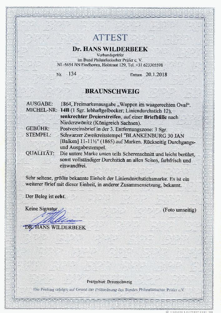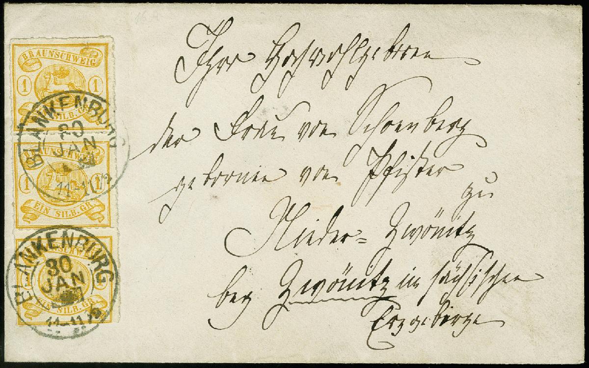 | Zusatzinformationen und Suchstichworte: | 366. Auktion Heinrich Köhler Auktionstermin 19.–24.03.2018 Los 8118 1 Silbergroschen durchstochen 12 im senkrechten 3er-Streifen, unten rechts Scherentrennung, sonst allseits einwandfrei durchstochen, mit zweimal sauber aufgesetztem schwarzen Doppelkreisstempel "BLANKENBURG 30 JAN" (1865) auf Briefkuvert nach Niederzwönitz in Sachsen; ein sehr schöner und frischer Brief; der 3er-Streifen ist die größte bekannte Einheit dieser Marke, auf Brief haben wir nur einen weiteren registriert Zuschlag 5.500,00 EUR |