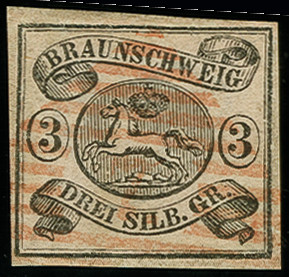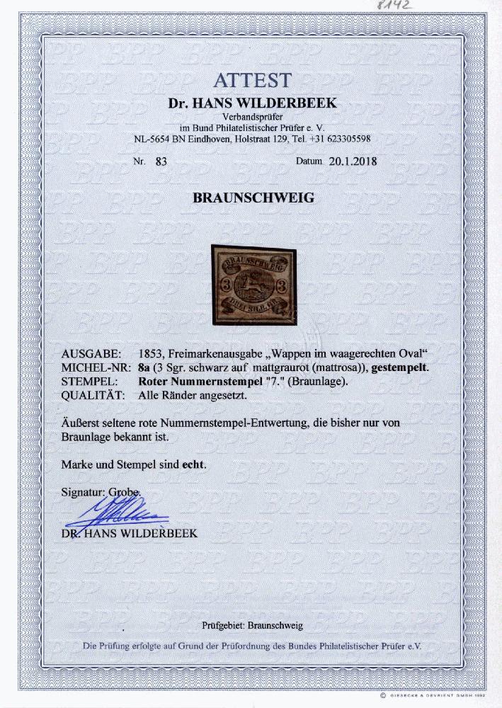 | Zusatzinformationen und Suchstichworte: | 366. Auktion Heinrich Köhler Auktionstermin 19.–24.03.2018 Los 8142 "7" BRAUNLAGE in rot, gerade und klar auf 3 Silbergroschen auf mattrosa, Ränder aus optischen Gründen ergänzt; allergrößte Stempel-Seltenheit, nur ganz wenige Stücke bekannt Zuschlag 460,00 EUR |