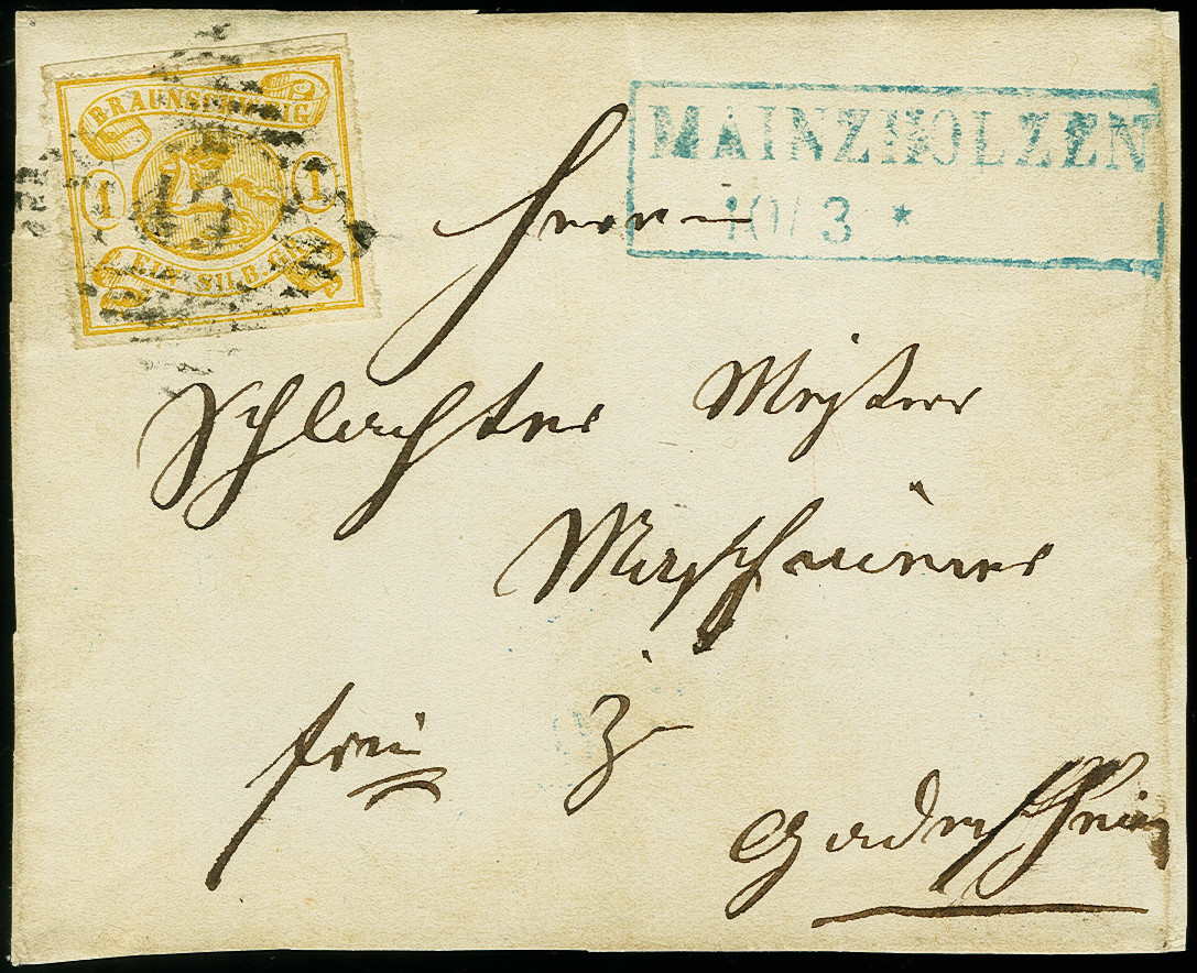 | Zusatzinformationen und Suchstichworte: | 366. Auktion Heinrich Köhler Auktionstermin 19.–24.03.2018 Los 8148 "49", sauber auf 1 Silbergroschen durchstochen 16 (teils Scherentrennung) auf kleiner Briefvorderseite mit sauber nebengesetztem Rahmenstempel "MAINZHOLZEN 10/3" nach Gandersheim; eine der Stempel-Seltenheiten Braunschweigs, nur ganz wenige Ganzstücke bekannt Zuschlag 850,00 EUR |